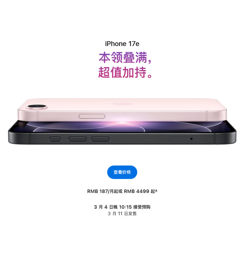 【iPhone17e正式发布iPhone17e下周发售】苹果公司:iPhone 17e 将于 3 月 11 日星期三开始发售。 iPhone17e起售价4499元