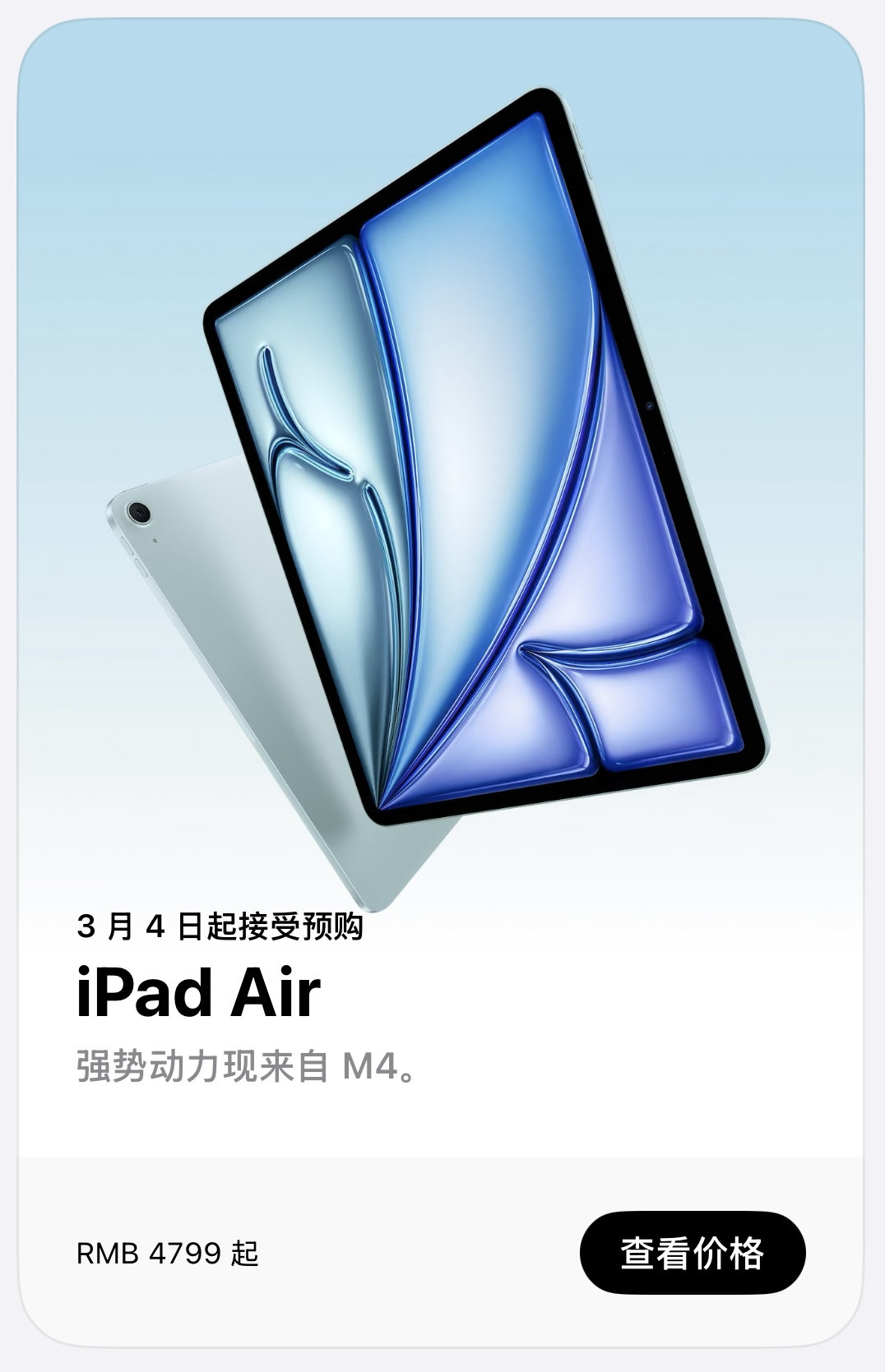 【M4芯片iPadAir价格M4芯片iPadAir起售价599美元】苹果:新款iPad Air 11英寸版起售价599美元,13英寸版起售价799美元。 苹果推出新款iPadAir