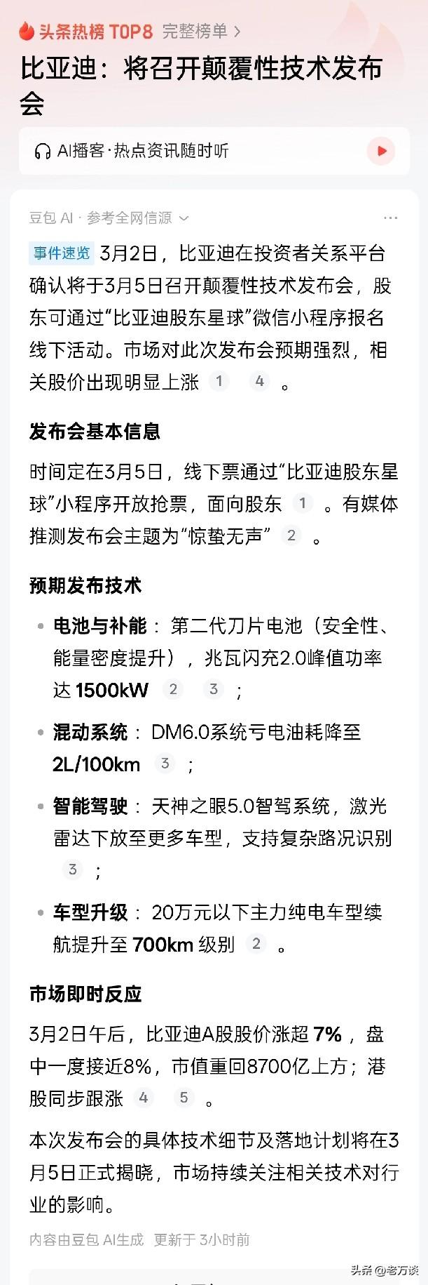 比亚迪宣布将召开颠覆性技术发布会,该发布会面向比亚迪股东。比亚迪经过这些年的发展,已经发展成为国内、国际新能源汽车的佼佼者、领航者。他的每次动向将成为新能源车的一次标志性事件。比亚迪汽车的每一次发展给新能源汽车带来的改进是巨大的。有网友预测了这次颠覆性技术发布会将解决两个方面的问题,第 1 个就是电池的续航能力,新能源车遭到消费者很大诟病的原因就是续航能力太低了,特别是冬季的续航能力更是严重缩水。第 2 个就是智能驾驶问题,新能源车将更加的智能驾驶,能够让更多的消费者享受科技发展带来的便利。希望比亚迪汽车发展得越来越好,能够给消费者带来越来越多的惊喜,带来低价且高质量的享受。比亚迪,中国造,中国造,中国行。