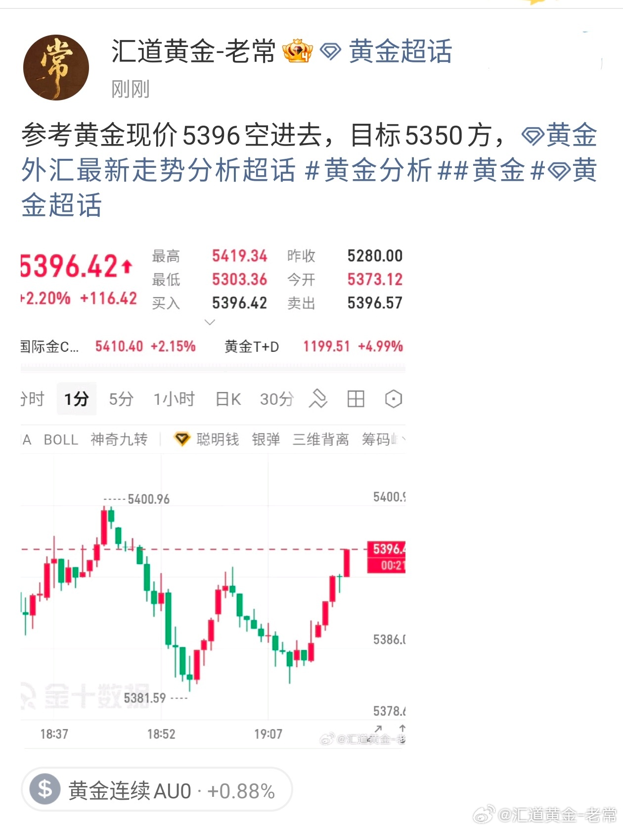 金价午间触底5074反弹至最高5226,老常也是果断通知实盘进场空单,老常也是博