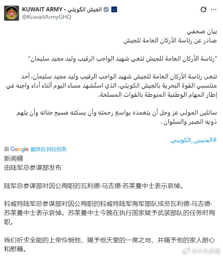 据科威特军方快讯,一名士兵周一在武装部队的“行动”中死亡。此前,科威特国防部表示,有多架美国军用飞机坠毁,所有机组人员均幸存。美以伊战场装备都升级了海外新鲜事黄媒不会说的真相