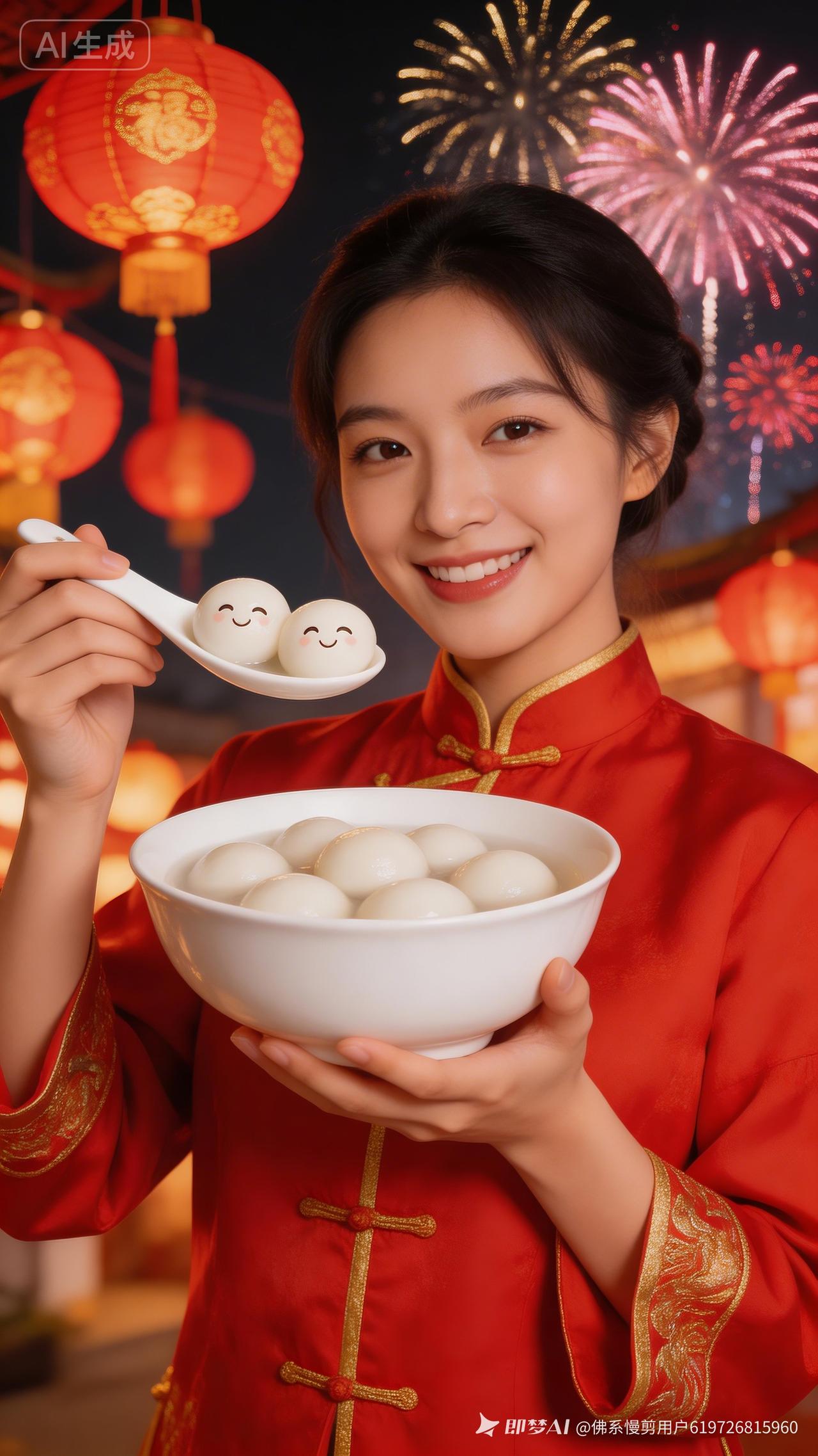 喜庆的元宵节,红灯笼下品尝香甜汤圆,笑语盈盈!🎉🍡😊