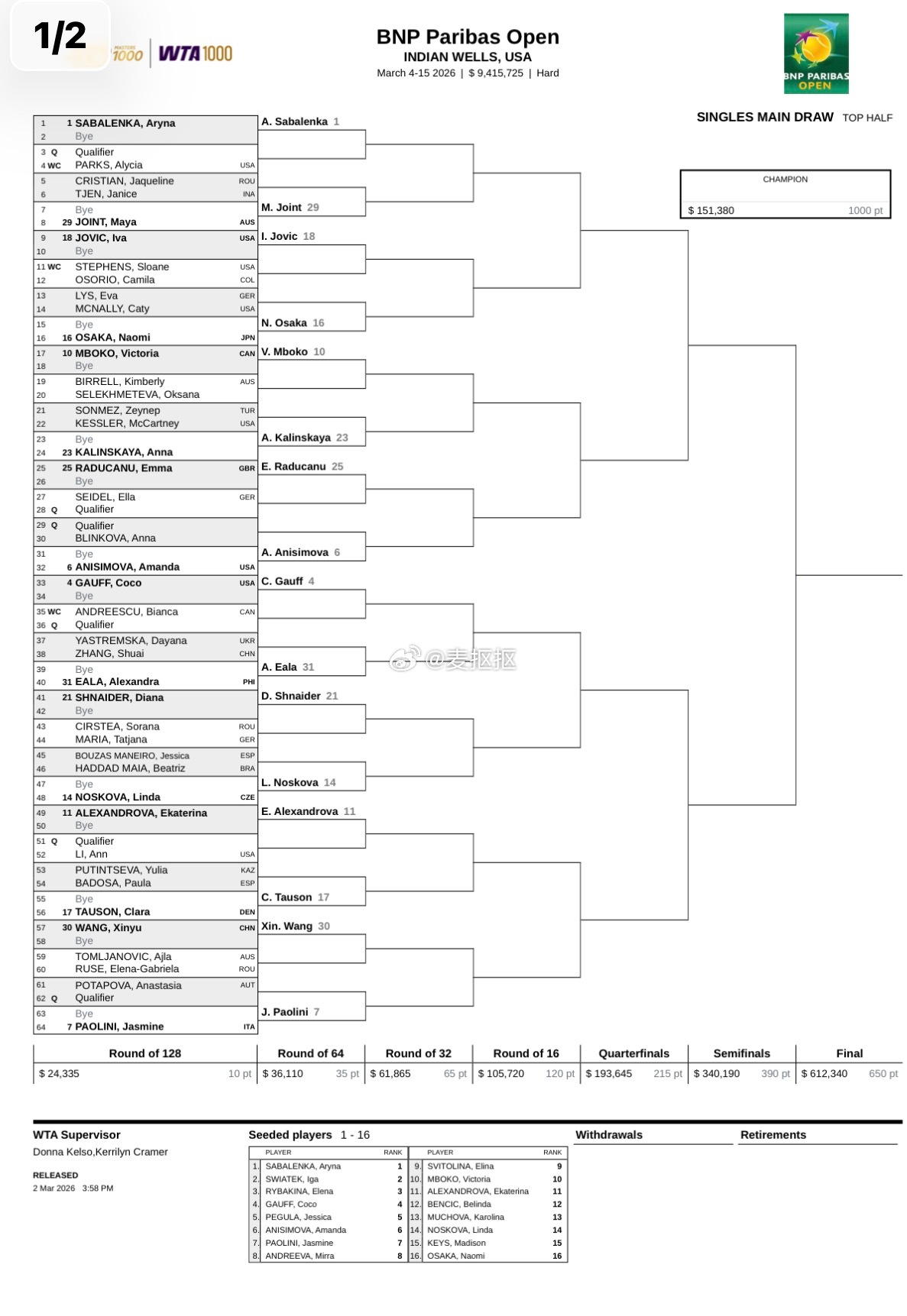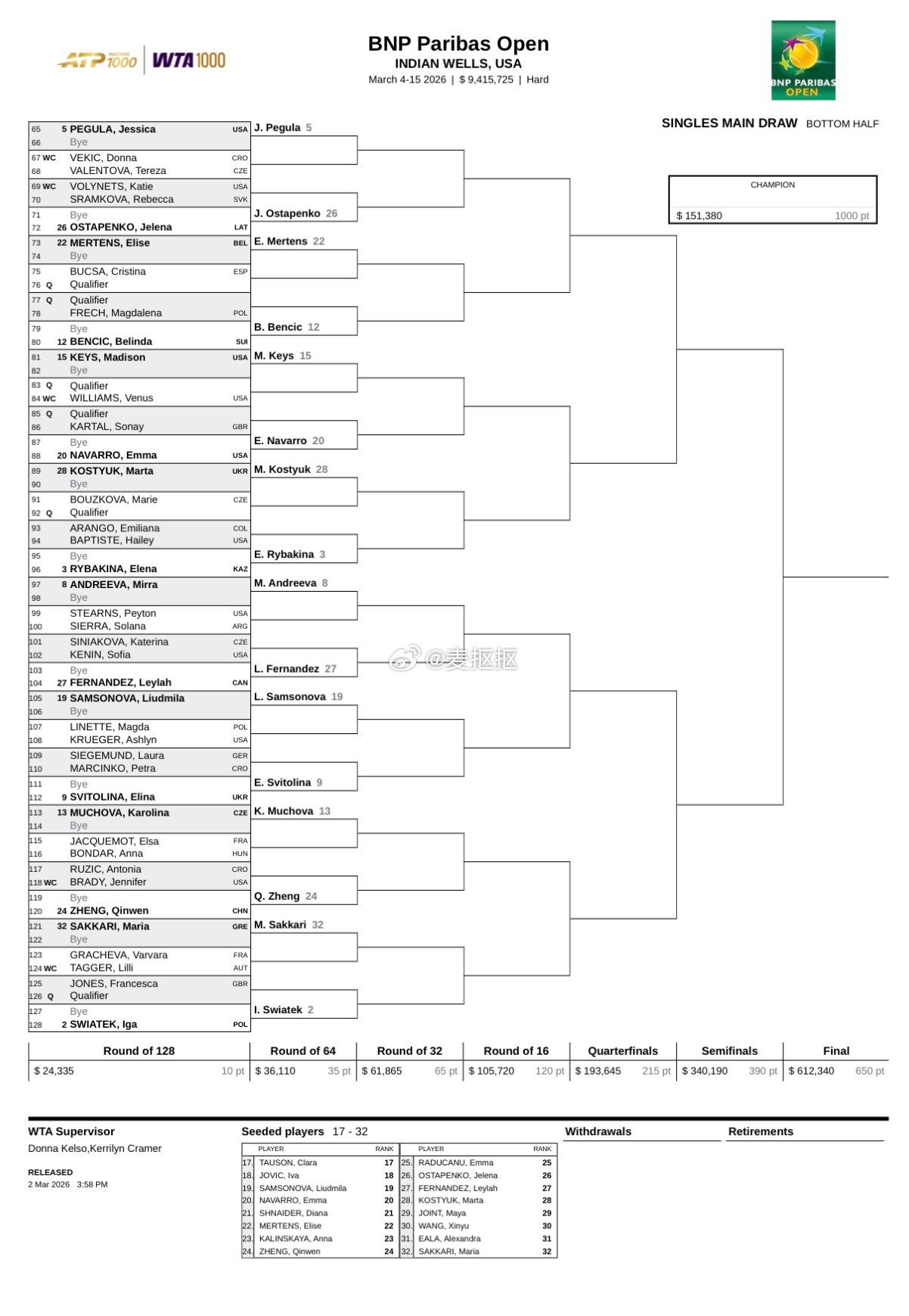 郑钦文以24号种子出战WTA1000印第安维尔斯赛潜在晋级对手• R1:轮空(种子福利)• R2:布雷迪(前澳网亚军)vs 鲁季奇(多哈八强) 胜者• R3:13号种子 穆霍娃(多哈1000冠军,状态火热)• R4:2号种子 斯瓦泰克 / 32号种子 萨卡里• QF:8号种子 安德列娃 / 9号种子 斯维托丽娜• SF:莱巴金娜 / 佩古拉• F:萨巴伦卡 / 高芙郑钦文印第安维尔斯赛签运郑钦文印第安维尔斯赛对位斯瓦泰克