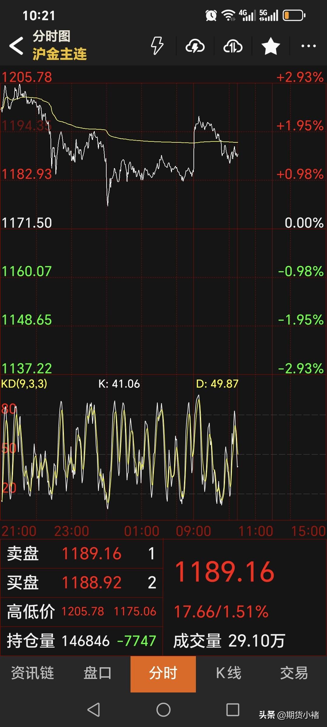 时间真快, 又到了国内商品 中场休息一刻钟时间。 昨晚国内黄金高开低走, 日内恢复交易后,有所拉升, 再度冲高,但是面对压力, 没能有效突破。 截止10:15分, 国内黄金期货 主力合约停收于1189.16元, 较上一日上涨17.66元。 对于黄金期货, 期货小褚观点不变!