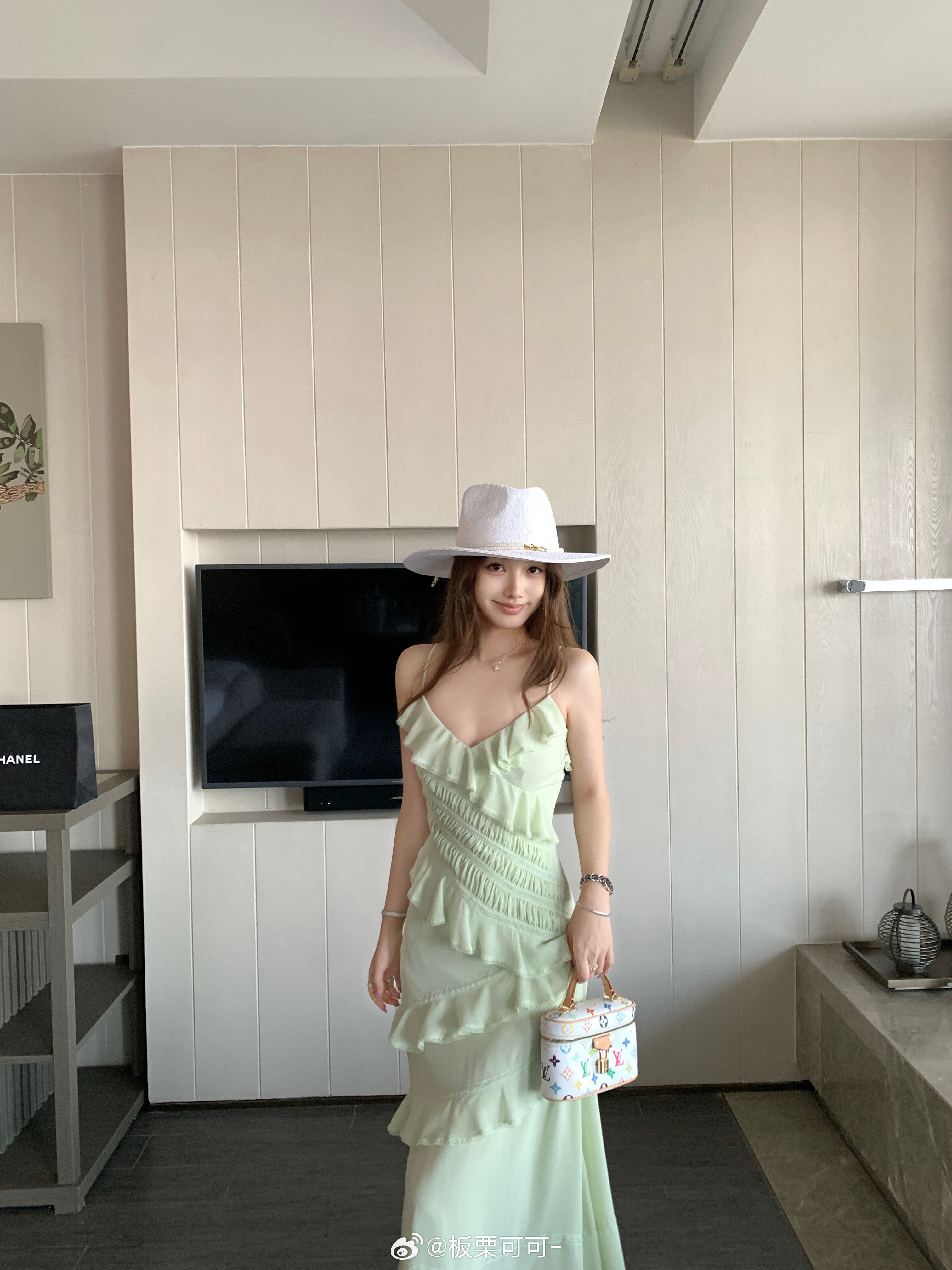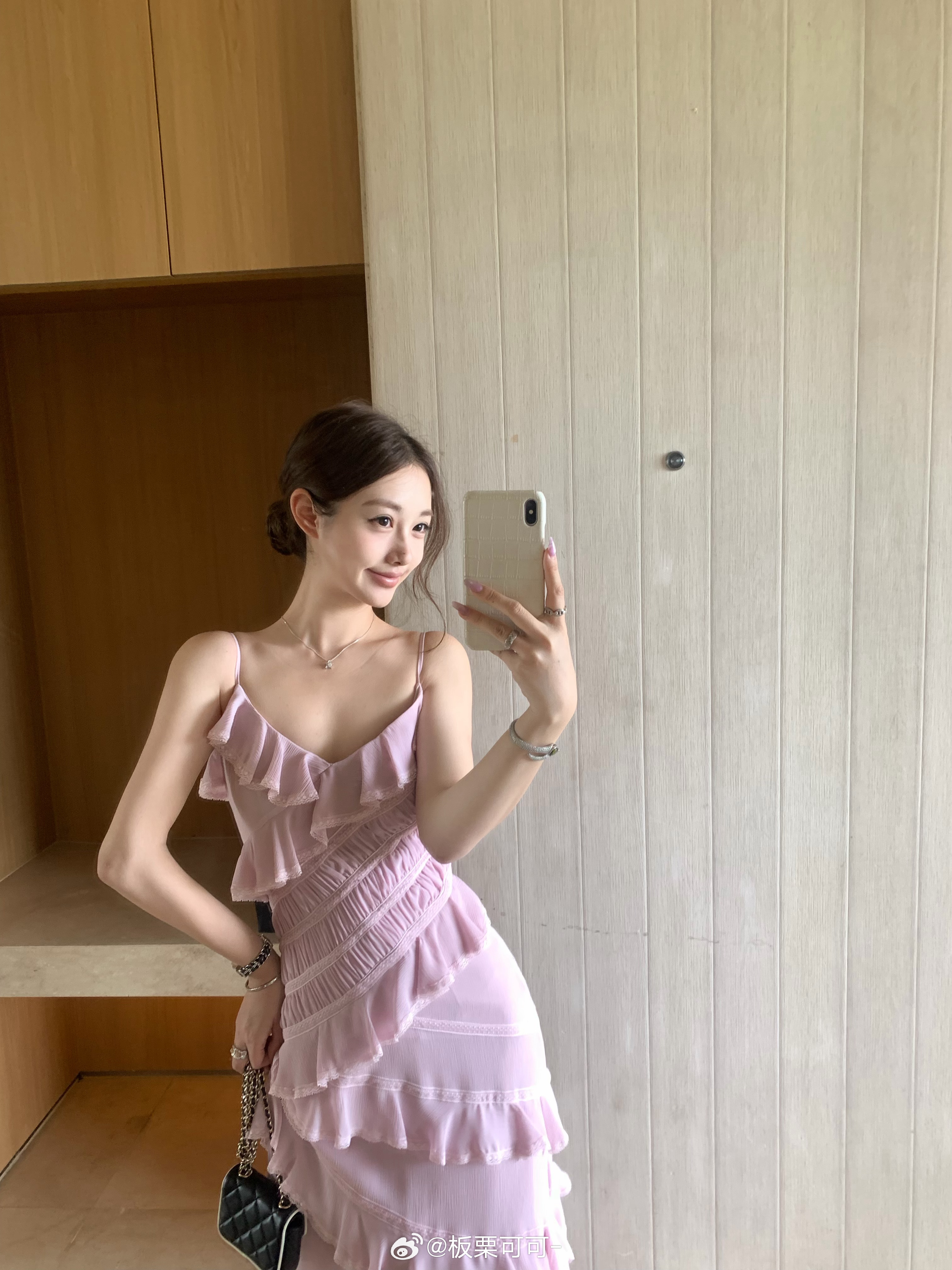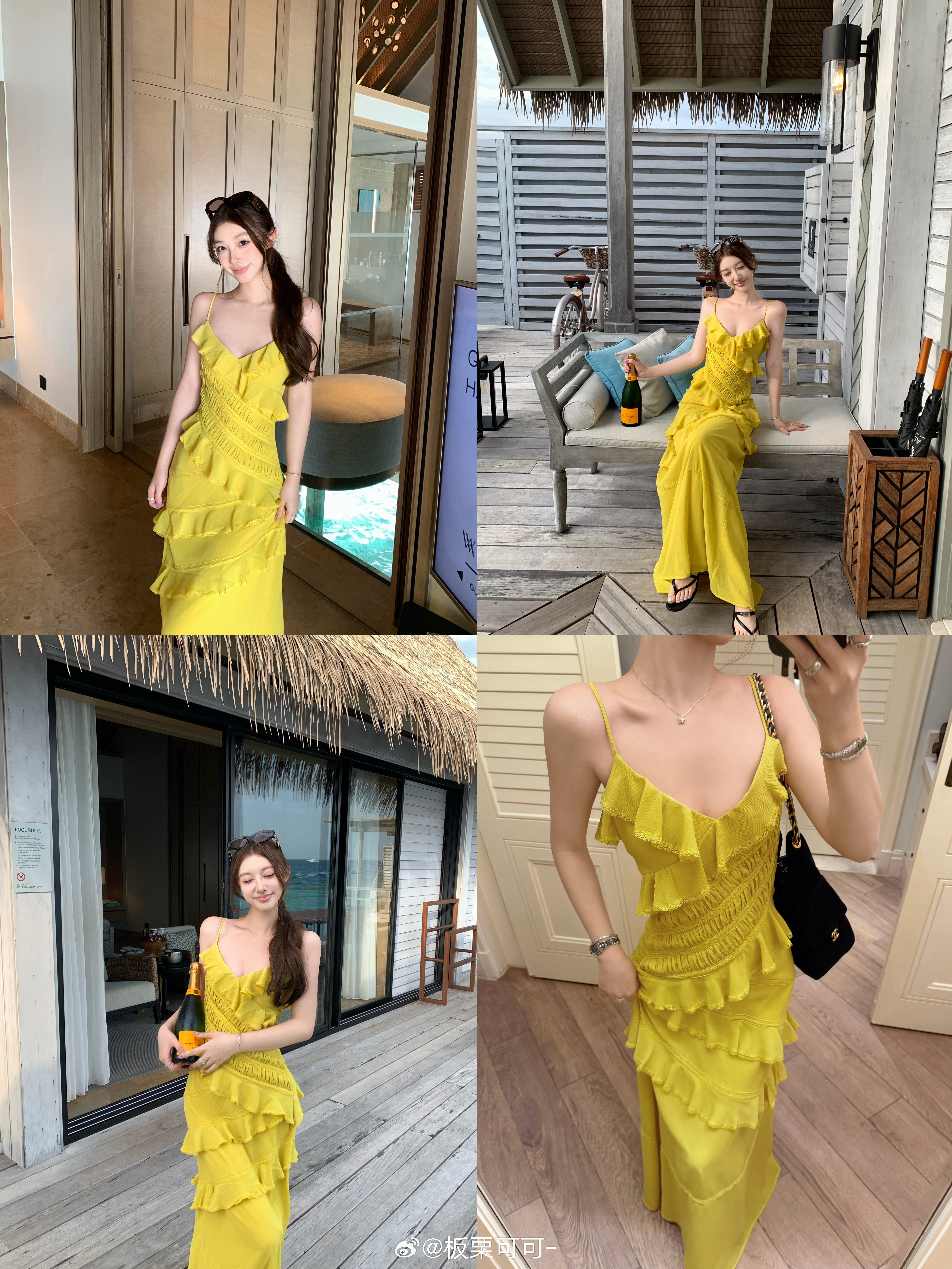 板栗可可Bankelili3/8/20:00👍🏻🍎揪2️⃣100⭕️⭕️~温柔系美感雪纺吊带长裙~大身不规则荷叶边设计 下摆走起路来步步生花🌸无论是度假约会或日常通勤搭配开衫都是仙女b备设计感连衣裙之选!!真的很适明媚和煦的春季!!💐