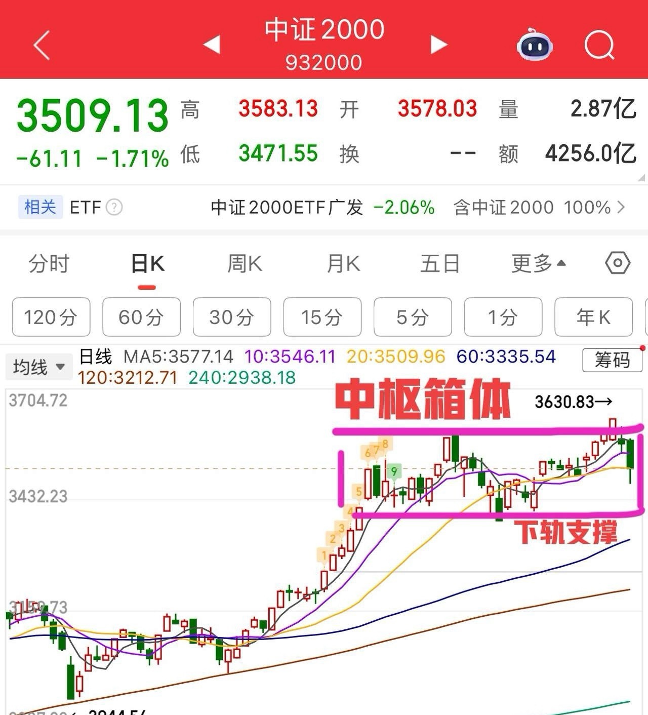 周二午评: 个股继续挨打的一天! 今天大盘基本上延续了昨天的剧本,指数不跌,个股继续挨揍,总体个股还是比较弱的,但偏偏指数很稳,这就很气人,今天大盘还是权重股在托着,银行涨了1%,再加上“三桶油”,指数想要跌下来也很难。如果没有权重护盘,那其实指数还是很难看的,所以当前指数重要性没有那么强。好不好还得看中证2000代表的小盘股或者直接看全A,更加靠谱。 上证指数方面,没啥好说的,观点不变,下方20日线不破就还是强势的走势结构,至于能否突破站稳4190,这个交给市场就可以,未真正突破之前,适当控制仓位来应对。 中证2000代表的是小盘的走势,这两天为什么走的那么差?技术面的角度,实际上处于日线顶背离阶段,即指数创新高,但下方macd未创新高,下方的红柱动能减弱,会有调整的技术需求。最强得一种调整方式,围绕均线做横盘震荡,第二主动回踩下方60日线或中枢下轨附近支撑。 我们要做的就是上证指数还没有确认突破站稳4190之前,看不到向上的力度,就先控制仓位。另一方面,看中证2000的走势,耐心等下来的机会就可以。从结构上看,其实就是上轨上不去,回下来考验下轨来了,如图所示。 备注:中证2000若回踩60日线是个股的机会。 个人观点,仅供参考!