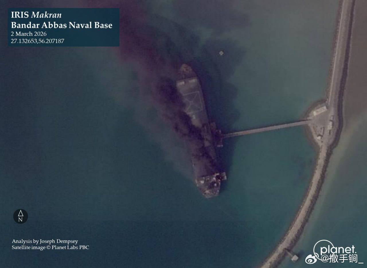 伊朗海军最大的舰艇——“Makran”号无人机母舰在阿巴斯港海军基地被击中燃烧。此舰是用一艘商用油轮改装。美国以色列对伊朗发动打击