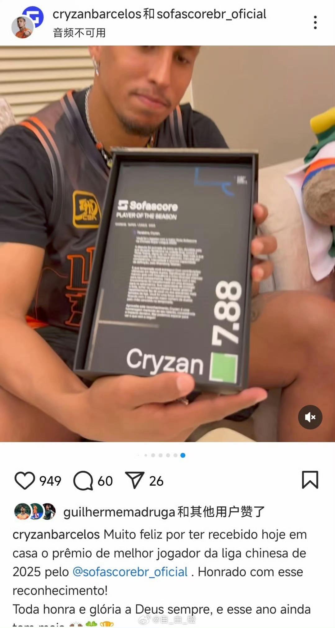 克雷桑获奖,身穿山东高速球衣社媒庆祝! 克雷桑更新社媒:克雷桑获Sofascor