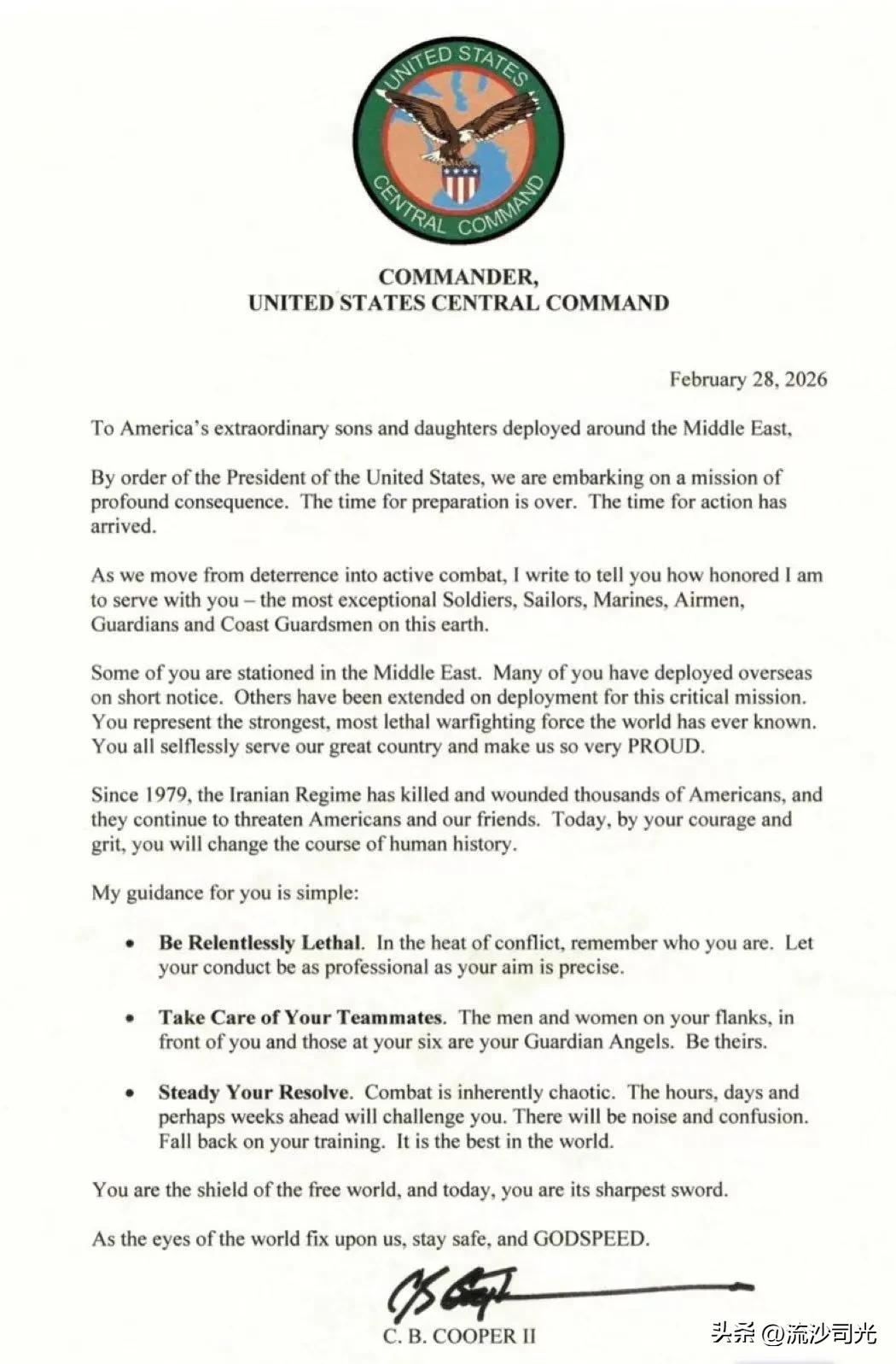 美军战前动员——美国中央司令部司令布拉德·库珀海军上将于2026年2月28日,在对伊朗发动“史诗狂怒行动”打击之前,向驻扎在中东各地的美国军人发出了一封信。 美国中央司令部指挥官,美国中央司令部2026年2月28日 致部署在中东地区的美国非凡儿女们:根据美国总统的命令,我们正踏上一项具有深远意义的任务。准备的时间已经结束,行动的时刻已到。 随着我们从威慑阶段转向主动作战阶段,我在此写信向您表达我对于能与诸位并肩作战的荣幸之情——您们是世上最杰出的士兵、水兵、海军陆战队员、空军人员、卫士以及海岸警卫队员。 你们中的一些人驻扎在中东地区。许多人在接到通知后迅速被派往海外执行任务。还有一些人则因参与这项至关重要的任务而延长了部署期。你们代表着全球有史以来最强大、最具杀伤力的作战力量。你们无私地为我们的伟大国家服务,令我们倍感自豪。 自1979年以来,伊朗政权已造成数千名美国人伤亡,并且他们仍在不断威胁着美国人和我们的友邦。今天,凭借你们的勇气与毅力,你们将改变人类历史的进程。 我对你们的指导很简单:坚持无情致命。在冲突的烈火中,请记住你是谁。让你的行为像你的目标一样精准专业。 照顾好你的队友。你两侧、前方以及六人小组中的男男女女,都是你的守护天使。要成为他们的依靠。 坚定你的决心。战斗本自带有混乱性。未来数小时、数天乃至数周都将对你构成挑战。其间会有嘈杂与混乱。请依靠你的训练来应对。这是世上最有效的手段。 你们是自由世界的盾牌,而今天,你们是它最锋利的剑。 当世界目光聚焦于我们时,请保持安全,并祝你们一路顺风。 C.B.库珀二世