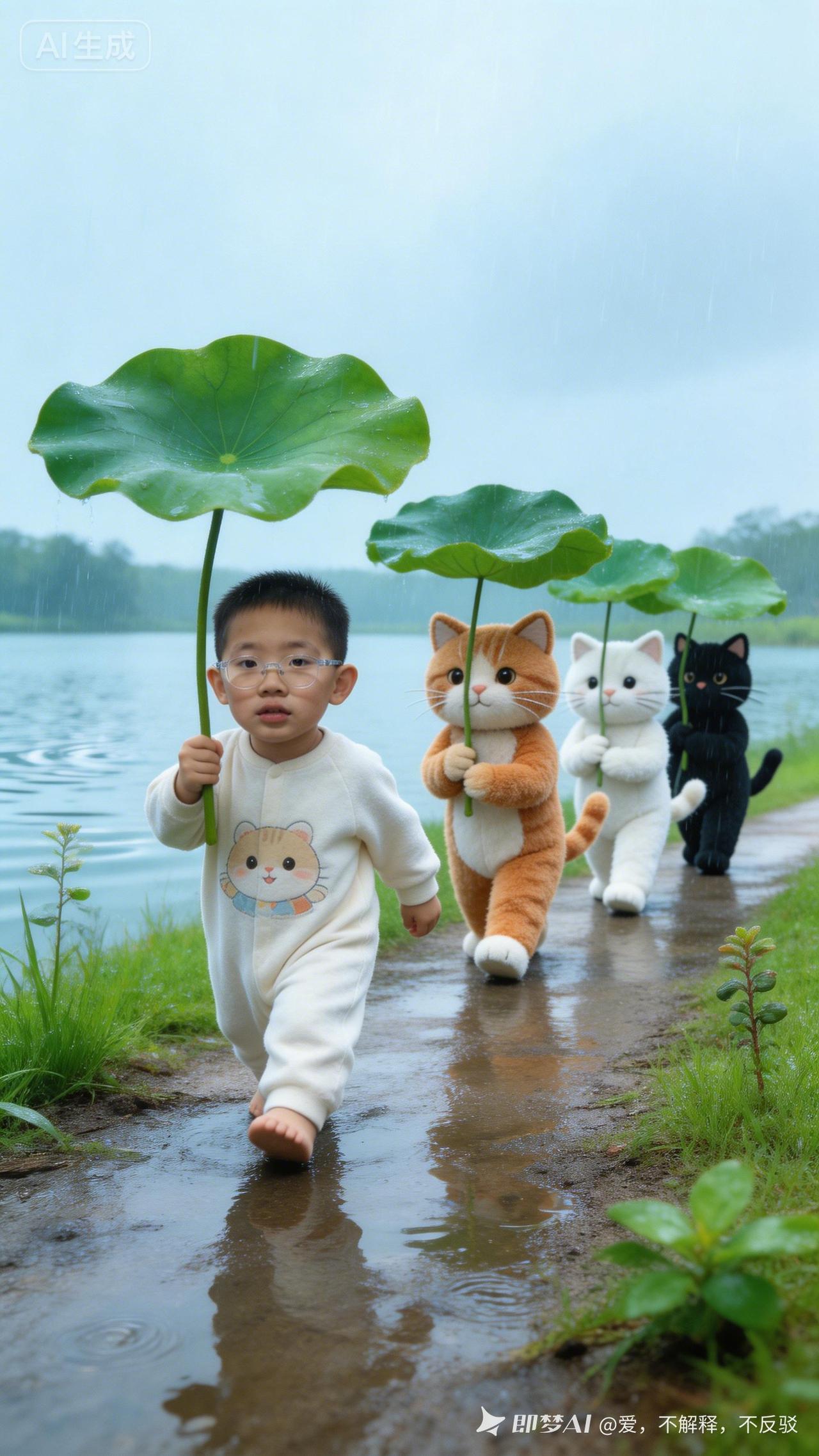 雨中漫步,萌娃与猫共行,童趣满满!🌧️🐱👶🏻