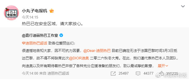 热巴目前一切平安迪丽热巴对接称已在安全区域 热巴对接号 刚刚转发了 的微博,明确告知热巴目前已在安全区域,请大家放心,一切平安。