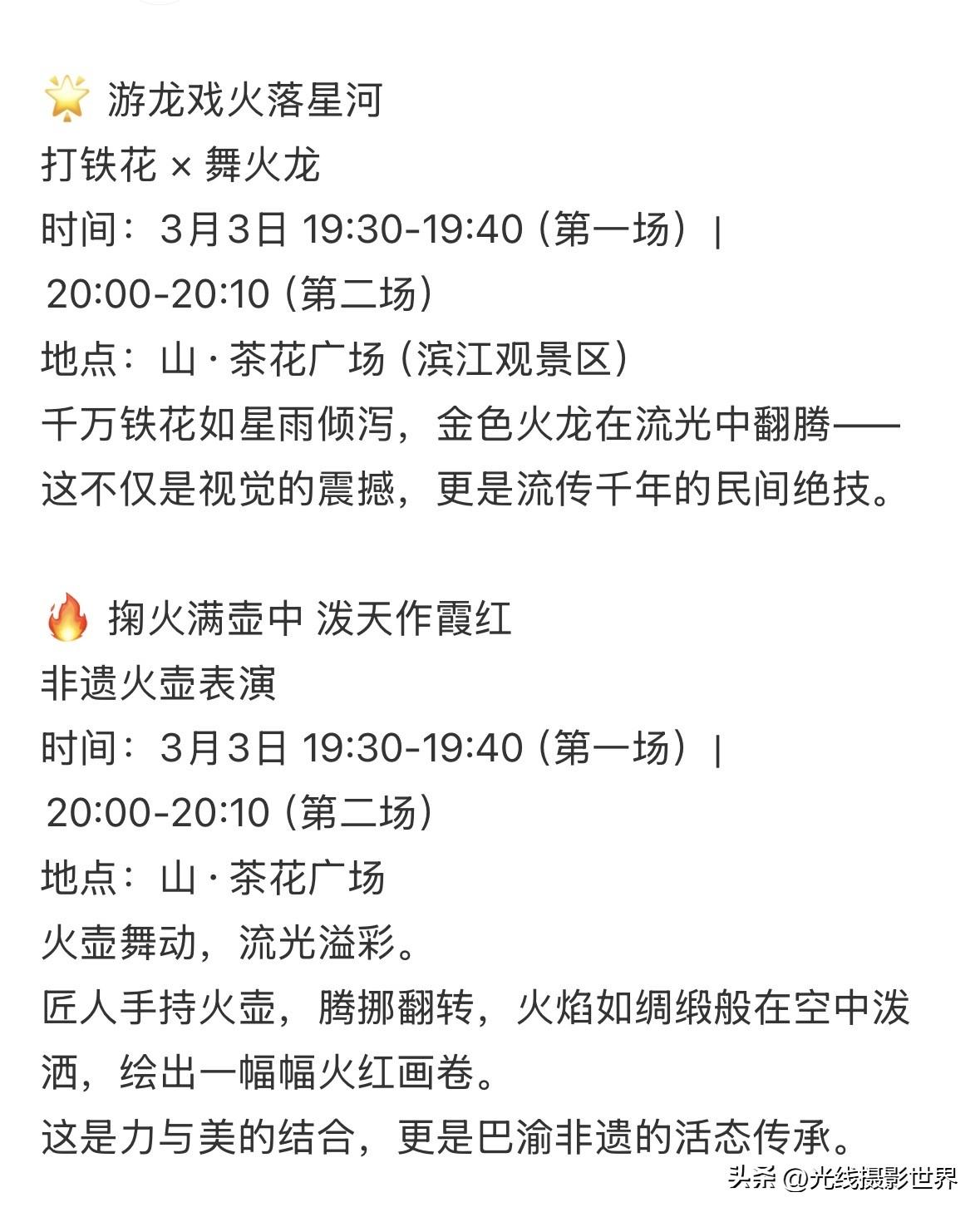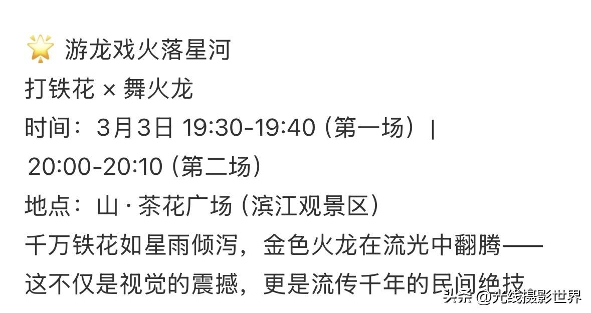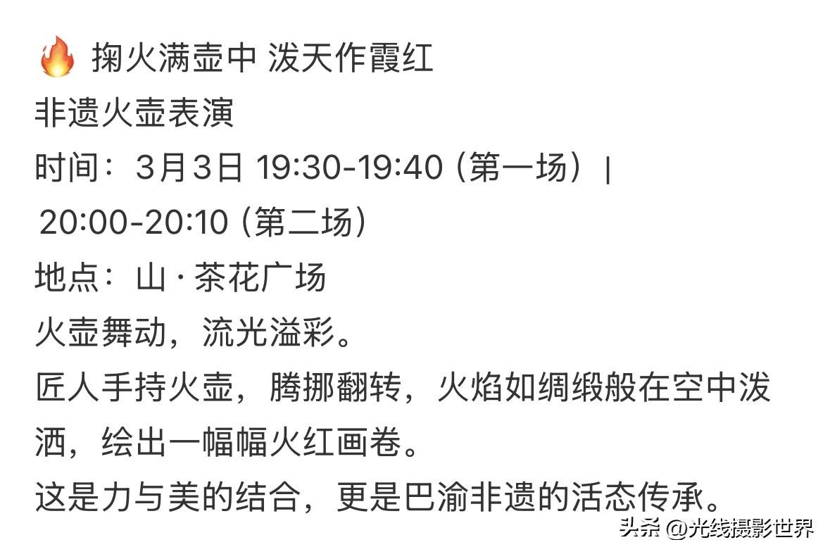 3月3日下午4点,我换上了一身破旧衣服,只为了今晚沉浸式体验舞火龙、打铁水、火壶闹元宵!今天是元宵节,重庆巴南区,融汇茶花广场,西流沱小镇……热闹非凡,闹元宵啦!嗯,这周边,还有三个大学,重庆理工大学,重庆交通大学,重庆工商大学……想必,今晚的茶花广场,可能会人山人海呀!太棒啦! 打铁花 × 舞火龙 时间:3月3日 19:30-19:40(第一场)|20:00-20:10(第二场) 地点:山·茶花广场(滨江观景区) 非遗火壶表演 时间:3月3日 19:30-19:40(第一场)|20:00-20:10(第二场) 地点:山·茶花广场 最近,重庆主城区,长江水位迅速下降……巴滨路的大多数江滩已经全部露出来啦! 李家沱长江大桥下捡好看的漂亮的石头甚至玉石……白居寺长江大桥下面露营野餐……骑自行车……徒步……特别安逸哦!