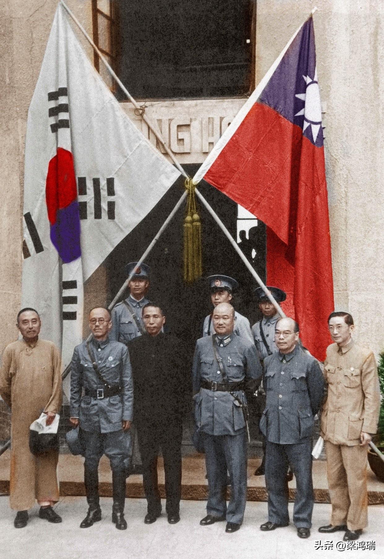 这张照片记录了 1940年9月17日,韩国光复军总司令部在中华民国陪都重庆嘉陵宾馆(嘉陇宾馆)举行成立典礼后的历史性时刻。 在抗日战争期间,大韩民国临时政府由于国土沦陷而流亡中国,并最终迁至重庆。为直接参与对日作战并争取国家独立,在蒋介石及国民政府的支持下,韩国光复军正式组建。 照片中前排核心人物包括: 金九 (Kim Gu): 画面中穿黑色长袍者,时任大韩民国临时政府主席,是韩国著名的独立运动领袖。 池青天 (Ji Cheong-cheon): 金九左侧穿军装者,出任韩国光复军总司令。 刘峙 (Liu Zhi): 金九右侧穿军装者,时任国民政府重庆卫戍司令,代表中国政府出席典礼并发表讲话。 视觉细节 旗帜: 背景交叉悬挂着大韩民国临时政府使用的太极旗和中华民国的青天白日满地红旗,象征着中韩两国在反抗日本殖民统治和侵略中的并肩战斗。 地点: 背景建筑上方可见“GUNG HO”或宾馆名称的部分字样,确认为当时的嘉陵宾馆。