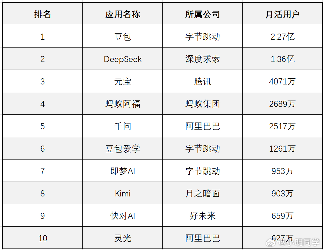 其中字节的豆包以超过2亿的月活位居榜首,另外字节旗下的豆包爱学和即梦AI也排名前十,是最大赢家。另外阿里系的蚂蚁阿福、千问和灵光也排名前十位,是目前AI领域实力最强的两家企业。