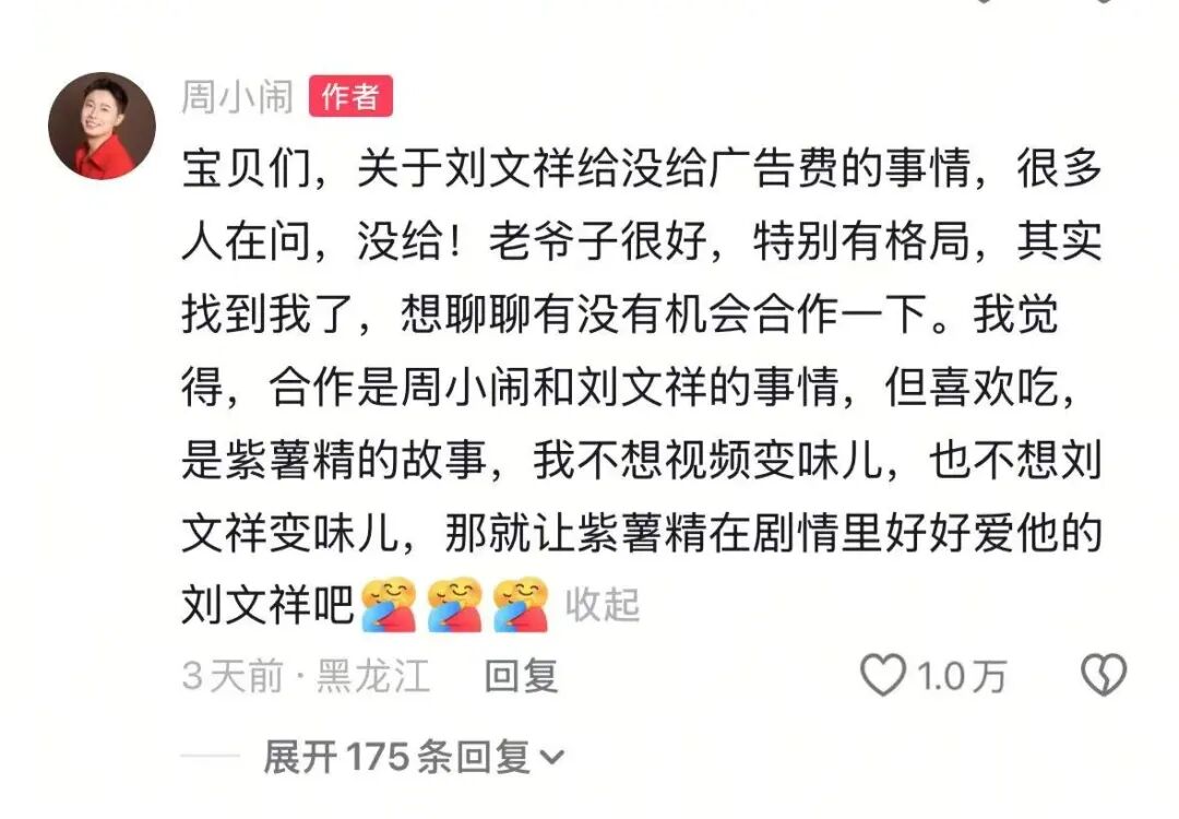 此外,周小闹在视频评论中回应是否与刘文祥合作,他表示:其实找到我了,想聊聊有没有机会合作一下。我觉得,合作是周小闹和刘文祥的事情,但喜欢吃,是紫薯精的故事,我不想视频变味儿,也不想刘文祥变味儿,那就让紫薯精在剧情里好好爱他的刘文祥吧。