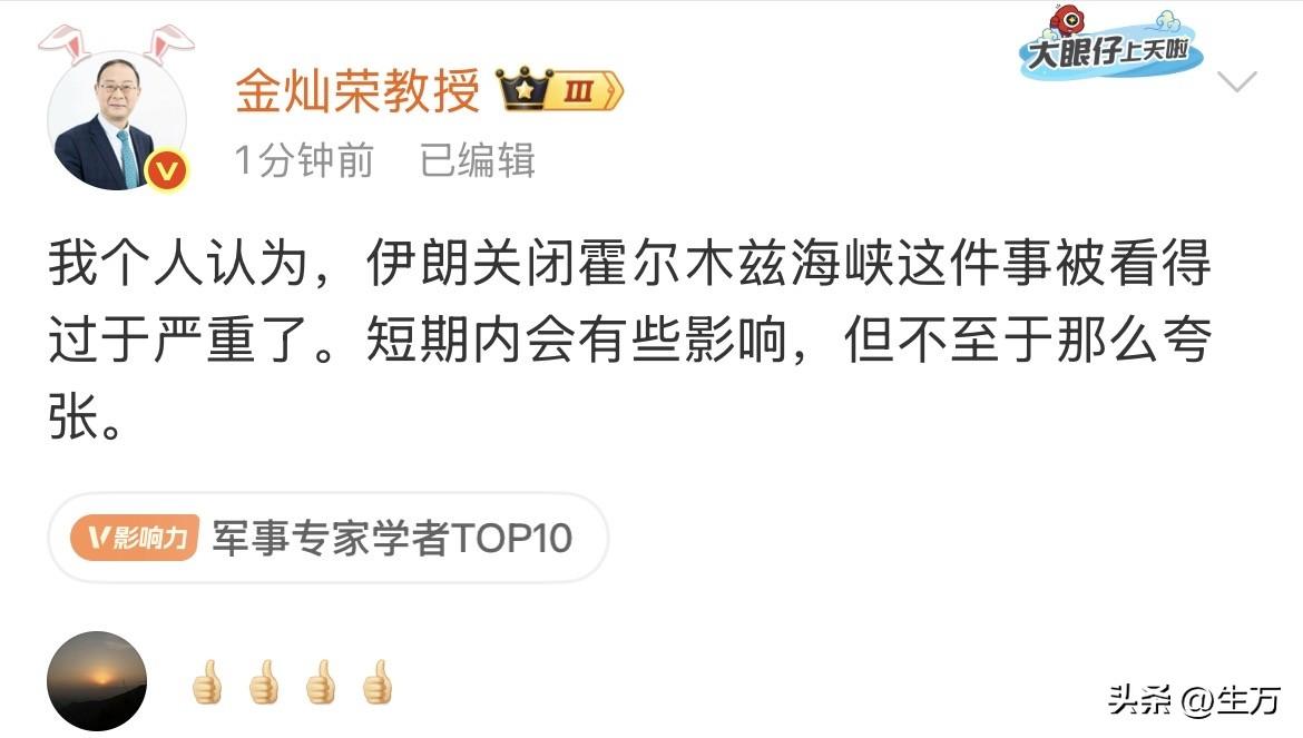 金灿荣:我个人认为,伊朗关闭霍尔木兹海峡这件事被看得过于严重了。短期内会有些影响,但不至于那么夸张。 就在刚才,金灿荣教授在网上提出了看起来完全相反的观点, 结合他前段时间发的视频来看,还是有他的理由的: 首先,咱们得承认,霍尔木兹海峡确实是个“要命”的关口。它就像全球能源的大门,每天全球约20%的石油都要从这里经过。伊朗放出狠话,甚至有油轮遇袭,这确实让市场“吓了一跳”,油价也跟着涨了一波。 但是,这扇大门并没有被彻底焊死,管道在悄悄输血,但其实沙特和阿联酋早就未雨绸缪,修好了绕开海峡的输油管道。虽然运力比不上大海道,但每天也能运出几百万桶。这就好比高速公路封路了,虽然堵,但旁边的国道还在通着车。 所以伊朗自己也是产油大国,石油是他们的“钱袋子”。彻底封锁海峡,等于把自己的财路也堵死了。更现实的情况是,他们会“敲山震虎”,制造威慑,而不是真的要搞“同归于尽”的永久封锁。 因此,虽然短期内运输成本高了,航程变长了(有些船不得不绕道非洲好望角),但油,依然在往外运,全球市场并没有出现“断顿儿”的情况。 涉及到我们开油车的人来说,虽然国际油价涨了,但咱们国内的成品油定价机制有个“保护罩”。它不是完全跟着国际炒作风向标跑的,而是有一套调控机制。这意味着,即便国际油价翻倍,传导到咱们加油站的价格,也会被“削峰填谷”,涨幅会温和得多。 就算国际油价大涨,落实到咱们加满一箱50升的油,可能也就多花二三十块钱。对于网约车司机或者经常跑长途的人来说,压力会大一些,但对大多数家庭来说,这属于“肉疼但能承受”的范围,还不至于让咱们不敢开车出门。 有人担心,油价一涨,运输成本增加,化肥、塑料这些化工产品也跟着涨,最后超市里的东西都得涨价。这逻辑没错,但现实的传导并没有那么快,也没有那么猛。 咱们国家的能源结构多元化做得很好,俄罗斯的油、中亚的气、还有咱们自己的新能源都在发力,对中东海峡的依赖并没有想象中那么单一。 所以大家该加油就加油,该买菜就买菜。 不必因为几条耸人听闻的新闻就陷入不必要的焦虑。在这个信息爆炸的时代,保持一份冷静和理性,看清事情的全貌,或许比囤积物资更重要。