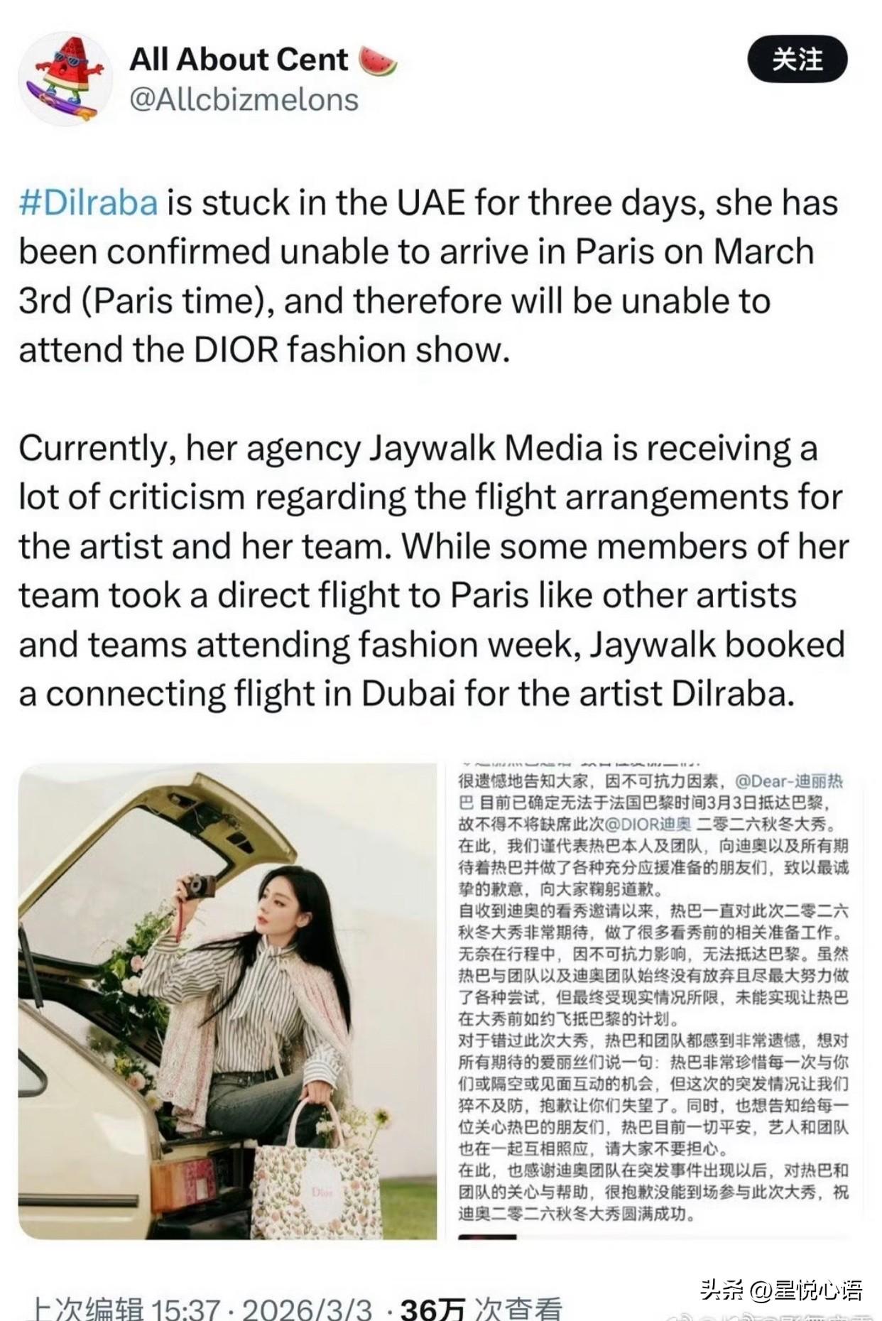 嘉行这波操作,真的把热巴坑惨了 嘉行传媒这下彻底扬名海外,却是因为离谱的行程安排。外媒都报道了热巴因迪拜转机滞留,遗憾缺席迪奥巴黎大秀,全网都在骂这波操作太业余。 明明有直飞巴黎的航线,工作人员全直飞待命。 偏偏让热巴独自走迪拜中转,还是使馆发了安全预警的高危地区。中东局势突变航班停飞,热巴滞留三天,团队却沉默不通报。 出事后只拿不可抗力搪塞,避重就轻不回应核心问题。粉丝心疼热巴身处险境,更气团队把艺人安全当儿戏。 作为迪奥全球大使,热巴为大秀精心准备,最终却错失亮相机会。 这哪里是不可抗力,分明是团队专业能力缺失。 无视风险、双标安排、公关敷衍,每一步都踩在雷点上。真的替热巴不值,顶级艺人配这样的团队,太糟心了!