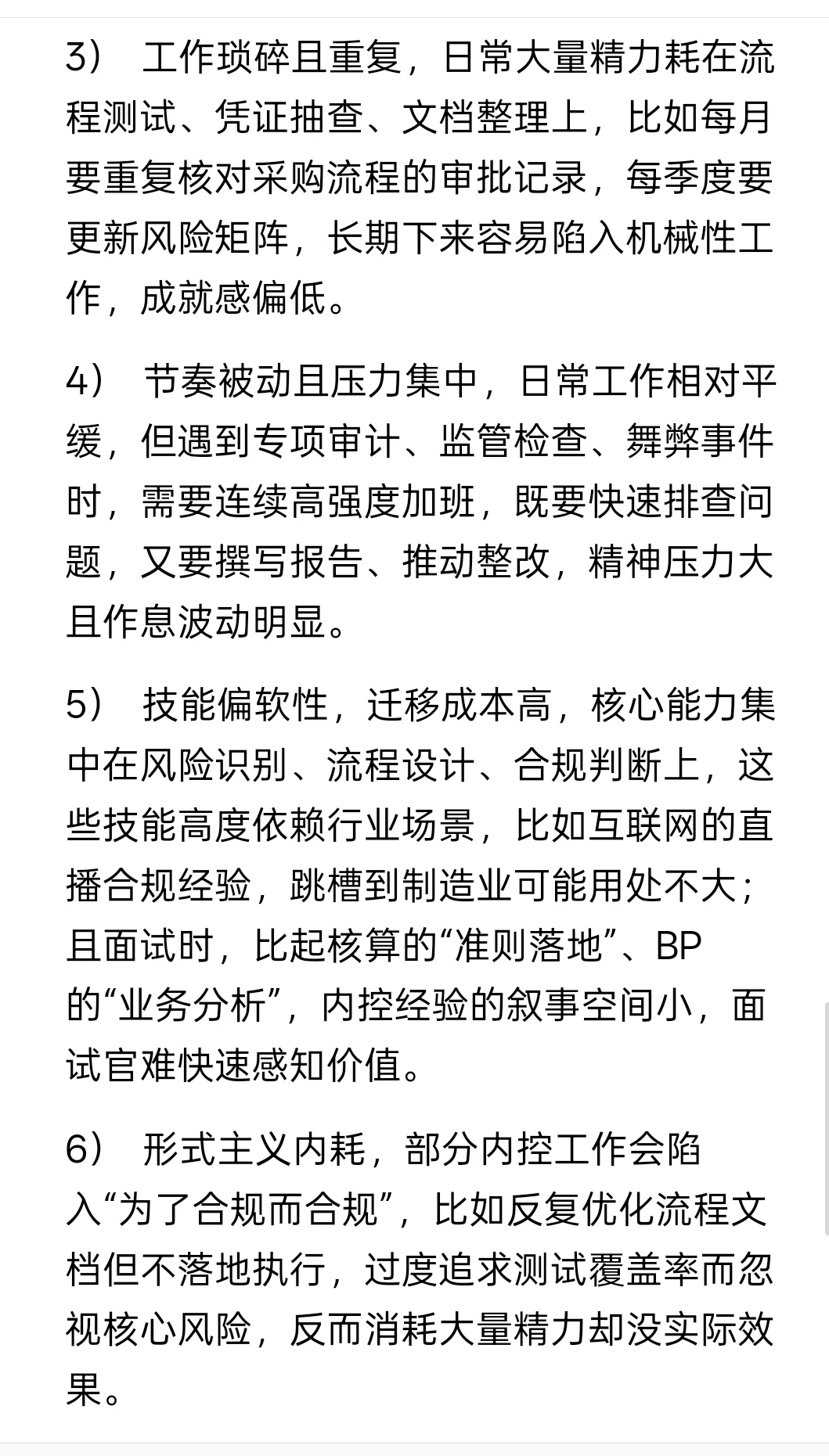 3. 发展历程:在毕马威做了5年内控与合规审计,期间主导过3个大型互联网客户的内控专项项目,考取CPA、CIA后晋升至高级审计。之前在一家中型互联网公司做合规专员1年,因想接触更复杂的业务场景和完善的内控体系,跳槽至头部大厂内控岗,负责电商、直播两条核心业务线的内控体系搭建、风险排查及整改落地。