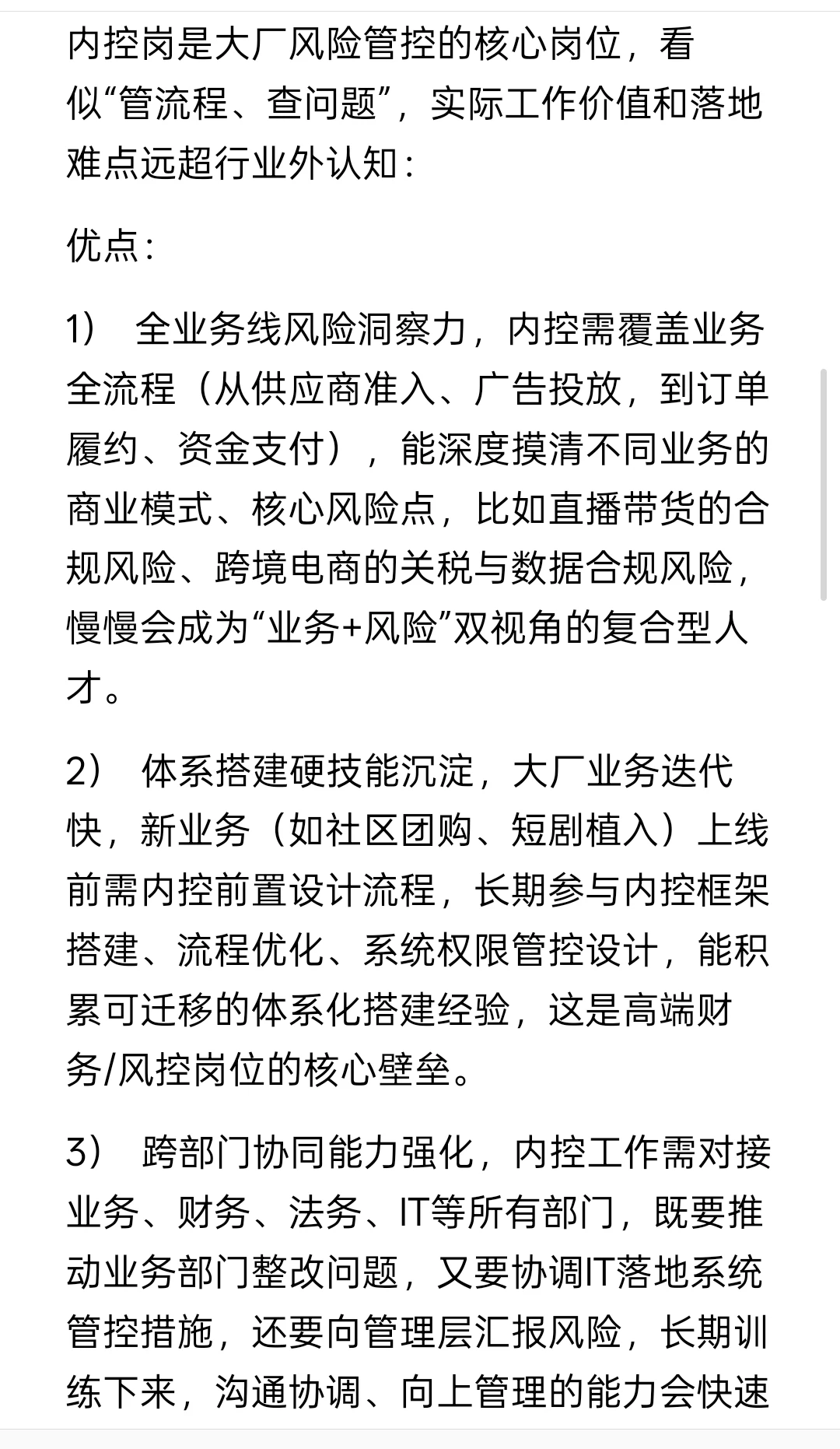 2) 体系搭建硬技能沉淀,大厂业务迭代快,新业务(如社区团购、短剧植入)上线前需内控前置设计流程,长期参与内控框架搭建、流程优化、系统权限管控设计,能积累可迁移的体系化搭建经验,这是高端财务/风控岗位的核心壁垒。