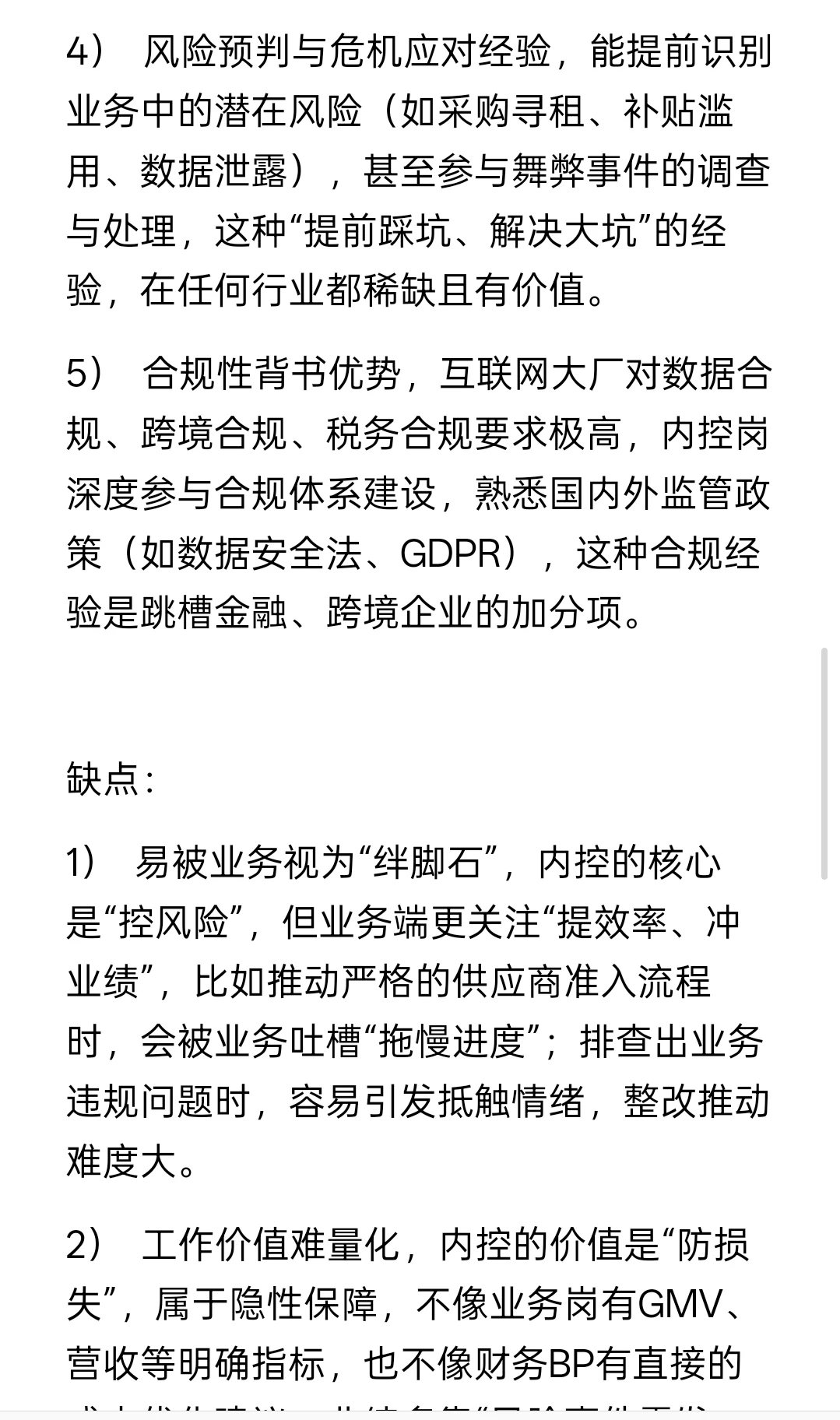 5) 合规性背书优势,互联网大厂对数据合规、跨境合规、税务合规要求极高,内控岗深度参与合规体系建设,熟悉国内外监管政策(如数据安全法、GDPR),这种合规经验是跳槽金融、跨境企业的加分项。
