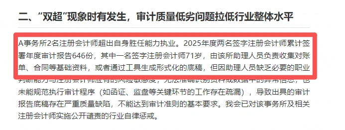 A事务所2名注册会计师超出自身胜任能力执业。2025年度两名签字注册会计师累计签署年度审计报告646份,其中一名签字注册会计师71岁,由该所助理人员负责收集对账单、合同等基础资料,或者通过工具生成形式化的底稿,但因助理人员缺乏必要的职业判断能力与注册会计师应有的风险敏感度,无法准确识别资料或数据中的异常信息,也未能规范执行审计程序(如函证、监盘等关键环节的工作存在疏漏),导致出具的审计报告底稿存在严重质量缺陷,不能达到审计准则的基本要求。我会已对该事务所及相关注册会计师实施公开谴责的行业自律惩戒。
