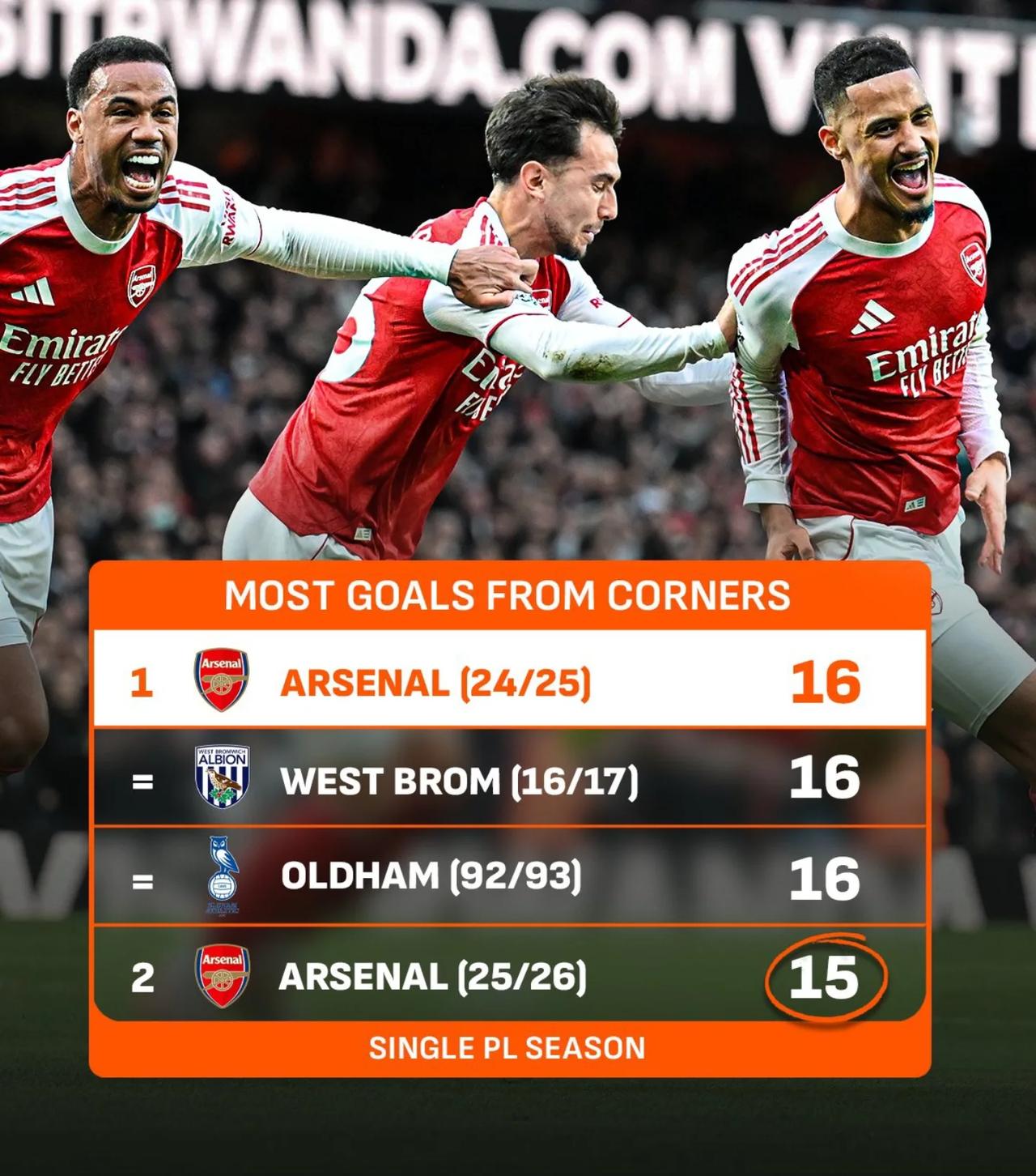 【再进一个角球就破纪录】在主场2-1击败切尔西后,阿森纳本赛季至今已通过角球在英超打入16球,追平了英超单赛季纪录! 目前,这一纪录由本赛季的阿森纳、16/17赛季的西布朗和92/93赛季的奥尔德汉姆共同保持。 阿森纳本赛季还有9场英超可踢,只要再通过角球打进一球,枪手就能独享这一纪录。阿森纳