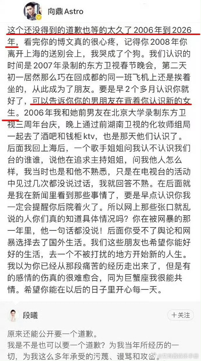 好男儿向鼎发博站队段曦,直接说心疼段曦,还说当时如果早点认识她,就能告诉段曦当时她的男朋友背着段曦认识新的女生,在追求主持人 。但向鼎没有指名道姓是张杰张杰前女友 被出轨是事实张杰回应加油好男儿向鼎力挺段曦