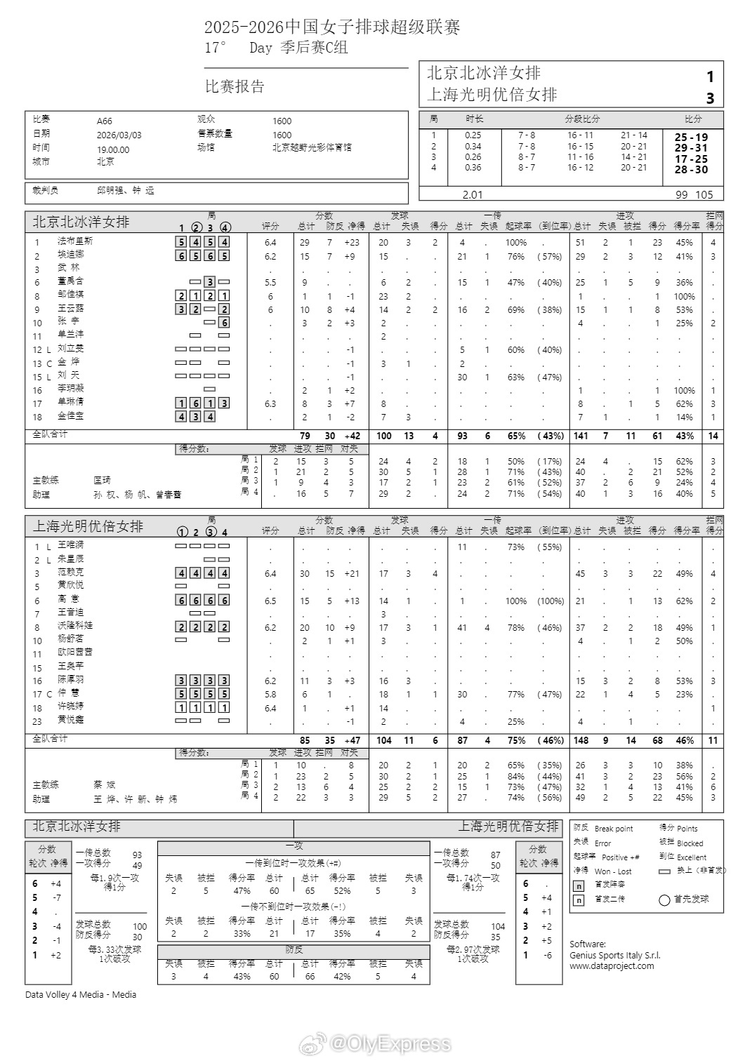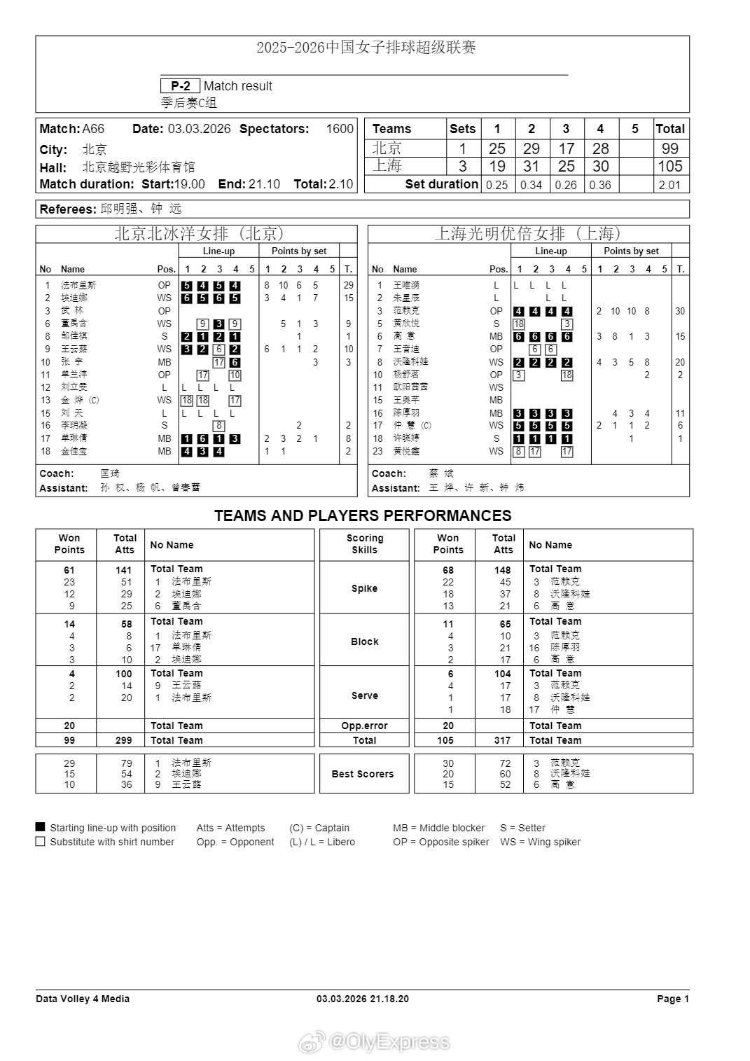 排超联赛3月3日,女排联赛两场季后赛技术统计。