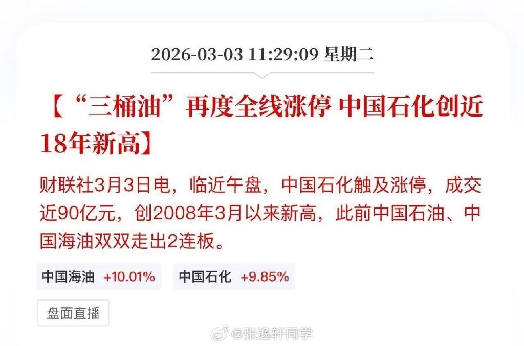 “三桶油”再度全线涨停,中国石化创近18年新高。