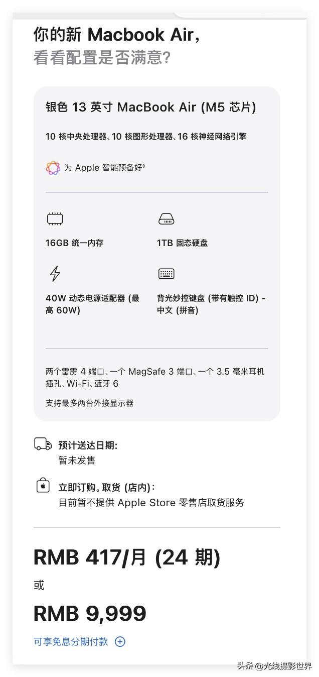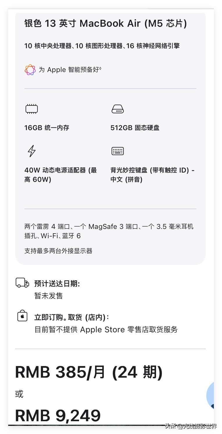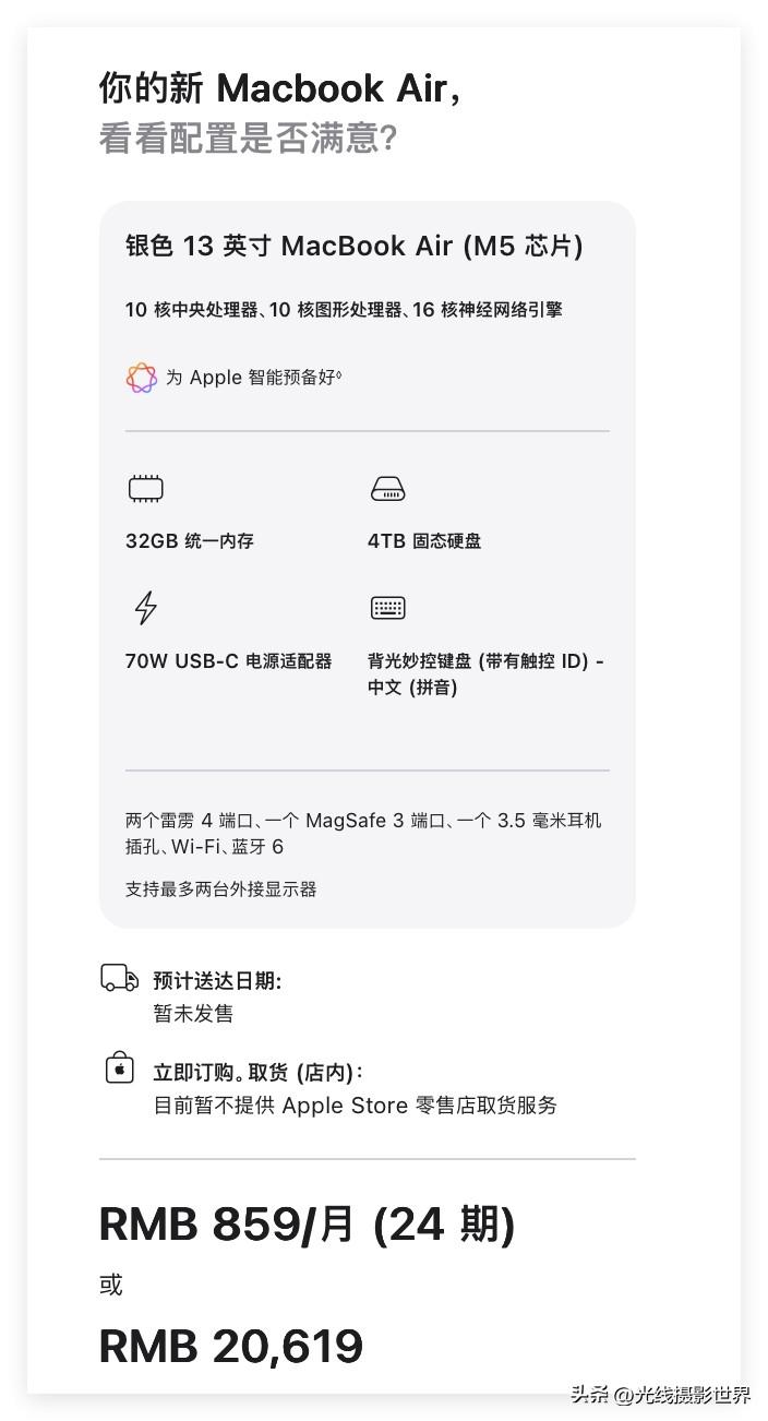 确实不算贵!满血版M5 CPU的苹果Macbook air,顶配,也只要20619块钱,32GB内存+4TB固态硬盘……这个配置,其实大多数自媒体创作者或者短视频创作者,其实都是够用的……2万块钱就可以拿下,在2026年春天来说,这个,确实不算贵。 2026年3月3日晚上,苹果全新发布了一些新产品……还是很可以,不错不错。光线摄影世界曾兰谈天说地