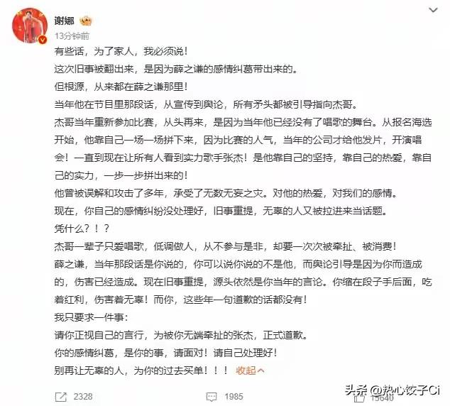 薛子谦在一档节目中说,作为一个歌手,一,我没有提前解约。二,我不偷不抢,三没有找一个有钱的女友给我发片。四,没有找一个比我红的女朋友来辅助我。有人说在暗示张杰,昨天谢娜发文要求他向张杰道歉!据说 张杰和薛之谦都是我型我秀比赛出身,签约同一个公司。后来张杰让粉丝众筹,据说100万解约,转身去参加快乐男声,后来跟着谢娜,一路借着快乐大本营…… 薛之谦某个综艺里调侃自己:不靠老婆,也不靠粉丝众筹~图片素材来自网上。