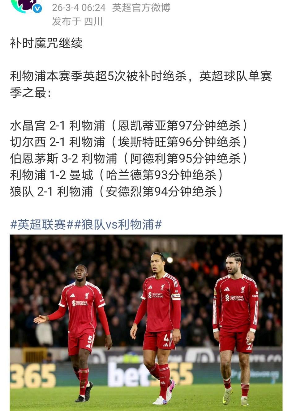 赛季初绝杀,赛末被绝杀,出来混的迟早要还!本赛季利物浦在英超已5次被补时绝杀(见图2)。 副班长狼队近三场主场战绩:2-2战平阿森纳(第1)、2-0战胜维拉(第3)、2-1战胜利物浦(第5)。 如果最终利物浦未能打进欧冠,一定会后悔这场比赛;狼队如果能保级成功,虽然是不可能的事,也一定会感谢利物浦雪中送炭。