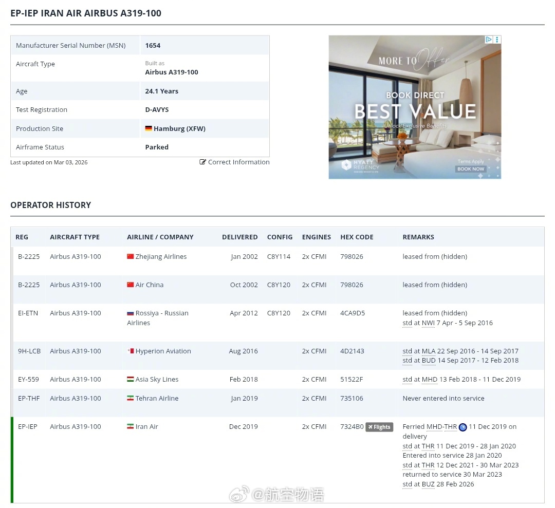 【伊朗一架A319战火中被毁,曾在中国服役10年】据伊朗官方通讯社报道,伊朗航空一架A319(EP-IEP)在布什尔机场被美以两国空袭摧毁。这架飞机最后执行的一个航班为2月28日的IR406,原定从布什尔飞往德黑兰,但也是因为美以空袭而返航布什尔……却没有想到这一次落地后再也没有机会起飞了