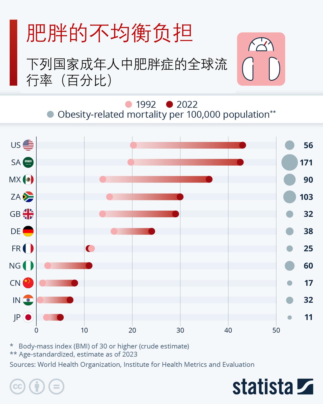 全球各地肥胖率是多少,因肥胖导致死亡率是多少? 每年 3 月 4 日的世界肥胖日旨在提高人们对肥胖这一日益严重的健康问题的认识:肥胖已从富裕国家的专属问题转变为全球性挑战。据世界卫生组织称,2022 年全球有近 9 亿成年人(18 岁及以上)患有肥胖症——这是一种由遗传、神经生物学、饮食行为和环境(例如获得健康饮食的机会)等复杂因素相互作用而引发的慢性、反复发作的疾病。肥胖会增加患严重健康问题的风险,包括 2 型糖尿病、心脏病、中风、某些癌症和过早死亡。 下面的信息图表基于世界卫生组织和健康指标与评估研究所的最新可比估计数据,展示了过去三十年全球成年人肥胖率的急剧上升情况。该图表对比了 1992 年和 2022 年十个选定国家中肥胖成年人(定义为体重指数 30 或更高)的估计比例,以及 2023 年每 10 万人中因肥胖导致的死亡人数。总体而言,数据表明这场危机几乎蔓延到了所有地方,但对健康的危害程度却大不相同。 在这一比较中,美国的肥胖率位居前列,成年人肥胖率从 1992 年的约 20%猛增至 2022 年的超过 40%,同时 2023 年每 10 万人中有 56 人因肥胖导致死亡。沙特阿拉伯和墨西哥的肥胖率也出现了类似的大幅上升(分别上升至 41%和 36%),并且在该数据集中死亡率负担也最为严重(分别为每 10 万人 171 人和 90 人死亡),这凸显了这些国家所面临的严峻挑战的规模。 在欧洲各地,情况各不相同。英国的肥胖率从 1992 年的约 14%上升至 2022 年的 29%(2023 年每 10 万人中有 32 人因肥胖导致死亡),而德国则从约 16%上升至 24%(每 10 万人中有 38 人因肥胖导致死亡)。在这项比较中,法国显得与众不同,其肥胖率在 1992 年和 2022 年大致保持在 11%左右,但每 10 万人中仍有 25 例与肥胖相关的死亡病例。 在非洲,该图表凸显了两种截然不同的情况。1992 年,南非的成年人肥胖率就已相对较高(15%),到 2022 年这一比例几乎翻了一番,达到 30%。同时,与肥胖相关的死亡率也急剧上升,2023 年每 10 万人中有 103 人死亡。相比之下,尼日利亚的肥胖率则要低得多(2022 年为 11%,而 20 世纪 90 年代初仅为 2%),但每 10 万人中仍有高达 60 人因肥胖导致死亡病例。这提醒我们,即便肥胖率尚未普及到如此程度,健康负担也可能十分严重。 在亚洲,随着经济的快速发展,肥胖率也在不断上升。在中国和印度,肥胖率从 1992 年的约 1%上升到了 21 世纪初的 7%至 8%之间。然而,日本却是个例外:同期从约 2%上升到了 5%,并且其死亡率负担最低(2023 年每 10 万人中有 11 人因肥胖导致死亡)。