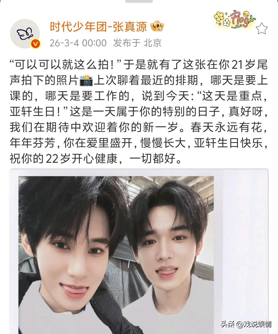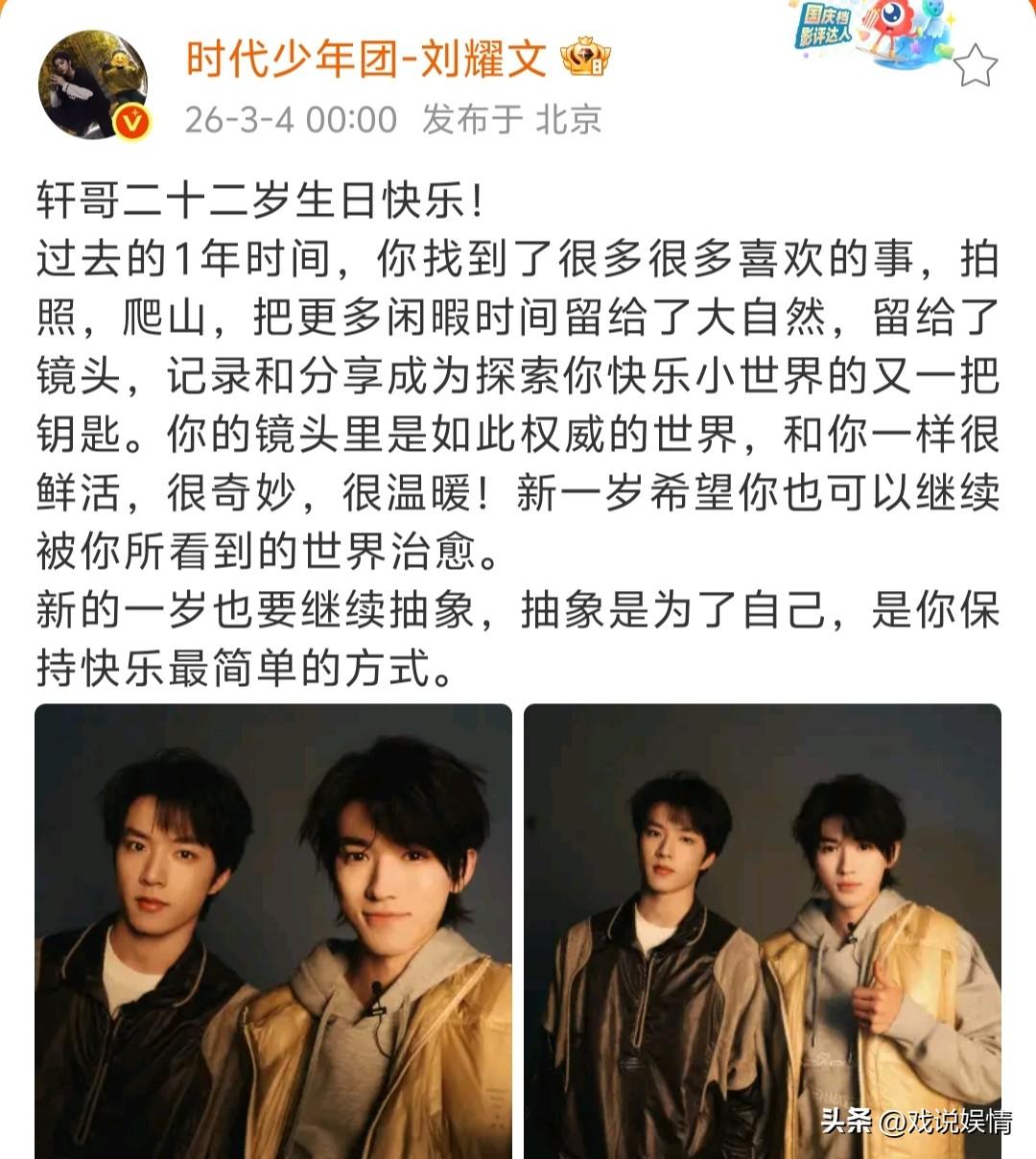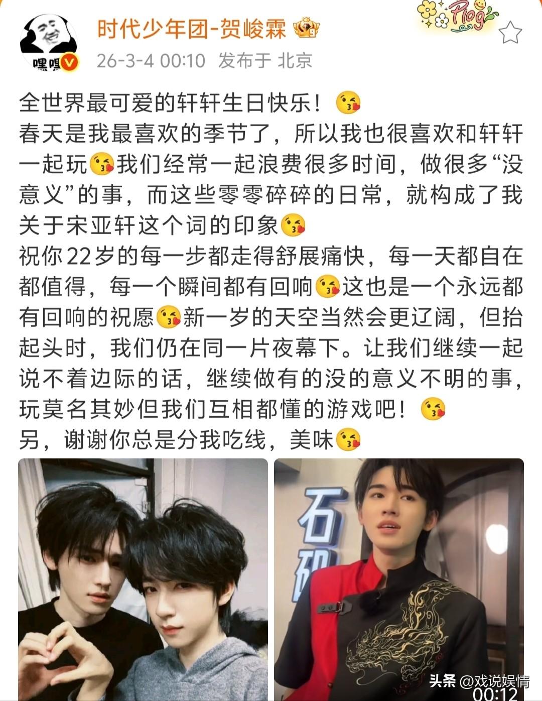 宋亚轩22岁生日,张真源、刘耀文、贺峻霖纷纷晒合照为其庆生。 3月4日凌晨,张真源零点卡点发文,“春天永远有花,年年芬芳,你在爱里盛开,慢慢长大”,这是对宋亚轩最美好的祝福。 “新的一岁也要继续抽象,抽象是为了自己,是你保持快乐最简单的方式。”保持抽象是刘耀文对宋亚轩的祝福,是期盼宋亚轩更快乐一些! 贺峻霖称:“我们经常一起浪费很多时间,做很多“没意义”的事,而这些零零碎碎的日常,就构成了我关于宋亚轩这个词的印象”,这就是真正的好朋友吧,好朋友在一起时琐碎的日常都是开心快乐的! 祝宋亚轩生日快乐!