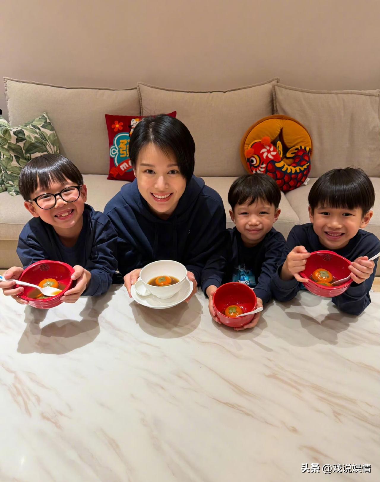 胡杏儿真会端水,三个儿子连碗都一模一样! 3月3日,胡杏儿分享了和一个儿子一起吃汤圆的照片庆祝元宵节。 三个小伙子穿着同款藏蓝色卫衣及秋裤,留着相同的发型,连碗和勺子都几乎一模一样,每个人碗中盛着相同数量的汤圆。三兄弟不笑时看起来好像,端着汤圆时内心满足得全都笑意盈盈。 胡杏儿真是端水大师啊,不仅三个儿子衣着打扮等几乎一样,胡杏儿自己也穿着和儿子们一样颜色的卫衣。一家人整整齐齐好温馨!
