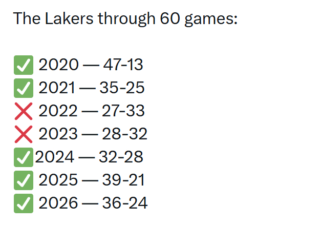 湖人本赛季已经打完了60场比赛,36胜24负,比上赛季同期多输了三场。2019-20赛季太强势,同期47胜13负。