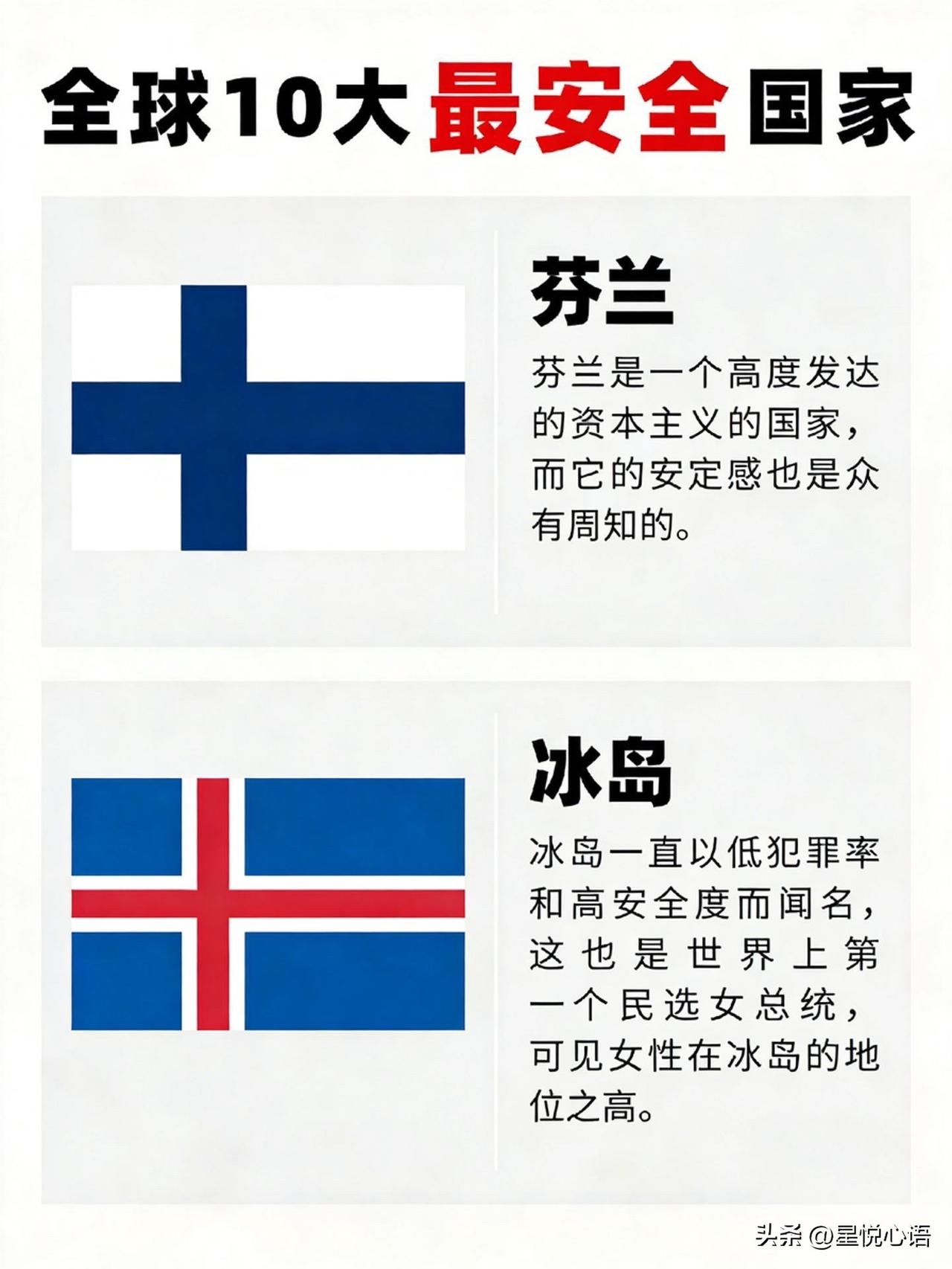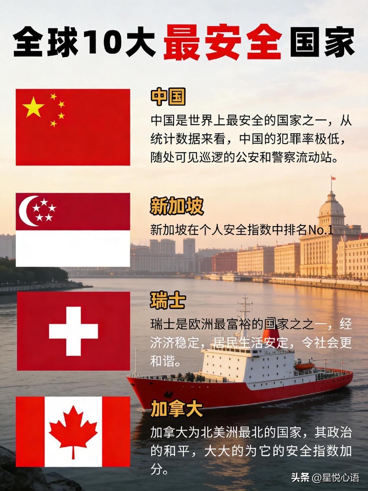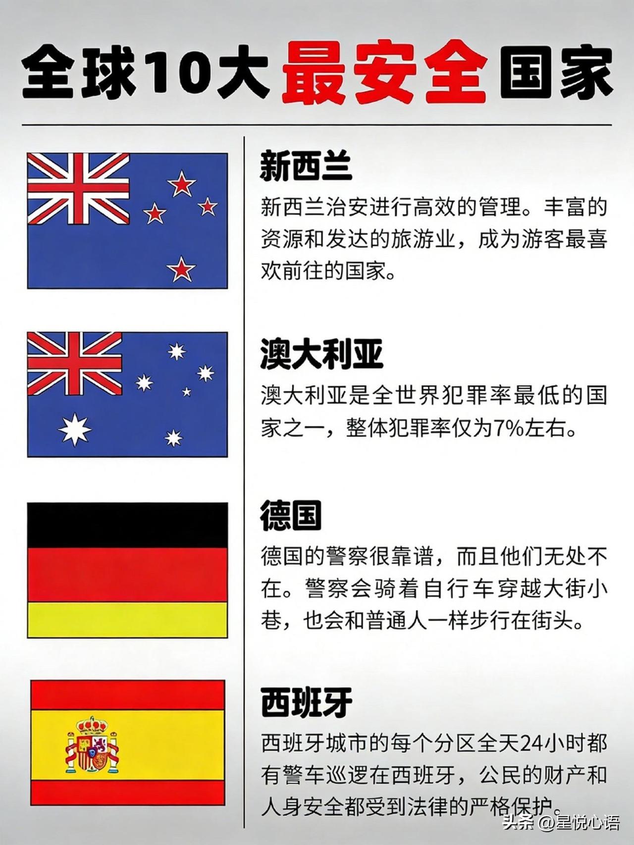 全球十大最安全国家榜单出炉了 看完心里真的满是感慨 先必须狠狠夸咱们中国 妥妥的世界最安全国家之一 犯罪率低到没话说 街头随处可见的巡逻公安和警务站 深夜出门也完全不用慌 这份踏实感,是刻在日常里的安心 榜单里还有不少口碑在线的国家 新加坡个人安全指数直接排第一 瑞士经济稳居民安,社会氛围超和谐 德国警察靠谱到无处不在 西班牙24小时警车巡逻护着安全 芬兰、冰岛常年霸榜安全榜单 低犯罪率高幸福感,属实让人羡慕 好多人问美国去哪了? 有网友一句话戳破:美国全世界最乱的 懂的都懂,到处挑起战争 天天枪击案频发,治安一言难尽 根本没资格挤进这份榜单 说到底,安全才是所有幸福的底色 不用羡慕别处的风景 咱们脚下的这片土地 就给了我们最足、最稳的安全感 生而为华夏人,一生为华夏魂!