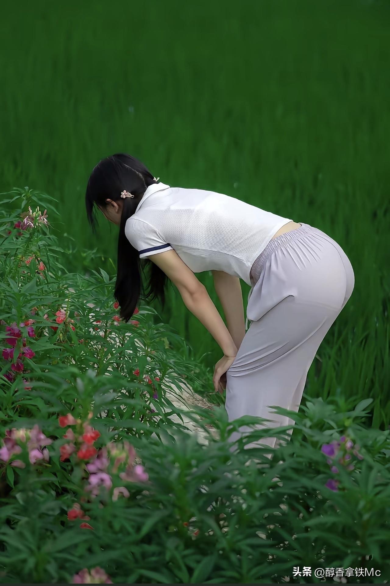 在花丛中弯腰的少女,绿意盎然的背景,仿佛置身于梦幻花园。风吹万物春 嫩芽初放 冬