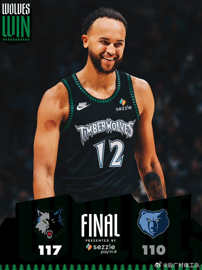 森林狼117-110主场险胜灰熊,爱德华兹发挥出色砍下41分6篮板5助攻,兰德尔23分11板4助、麦克丹尼尔斯16分7板1助;灰熊方面韦尔斯19分1板、科沃德15分2板1助、杰罗姆14分4板2助。