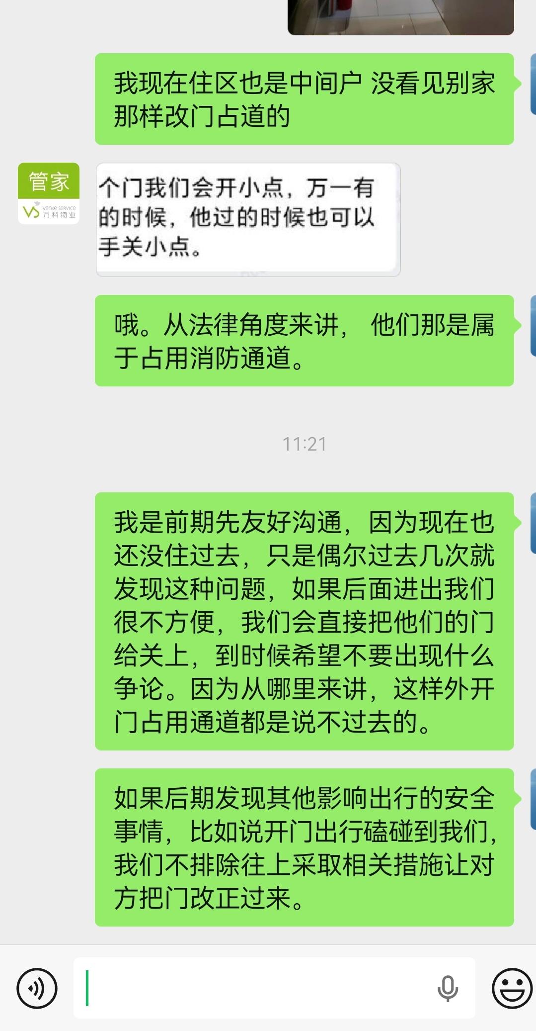 你们要的隔壁私自将内开门改外开门占用通道的处理后续来了,我反馈了万科物业,但是他们其实也不敢强硬去反馈,本着友好相处的原则前期我还是先愿意让一让,假如双方都配合好的话问题也不大,假如后期经常开门磕碰到我进出,我也说了要采取强硬手段。隔壁说现在只能尽量把门关小的,当然还有门口摆拖鞋的事情,我也让物业去管了,万科物业的物业费收很高的,其实很多时候我觉得也不够强硬,楼道摆鞋子乱摆东西的多了去。没有想象得好,还是在广州,给差评好像没多大用,作为老万科业主的发声,很多小事其实服务细节还是可以的,但一对上业主的事情就怂了。 所以我倒是很想听听广州的朋友来吐槽一下哪个物业管理这类事情比较好,以后买房还是得先打听物业的口碑。