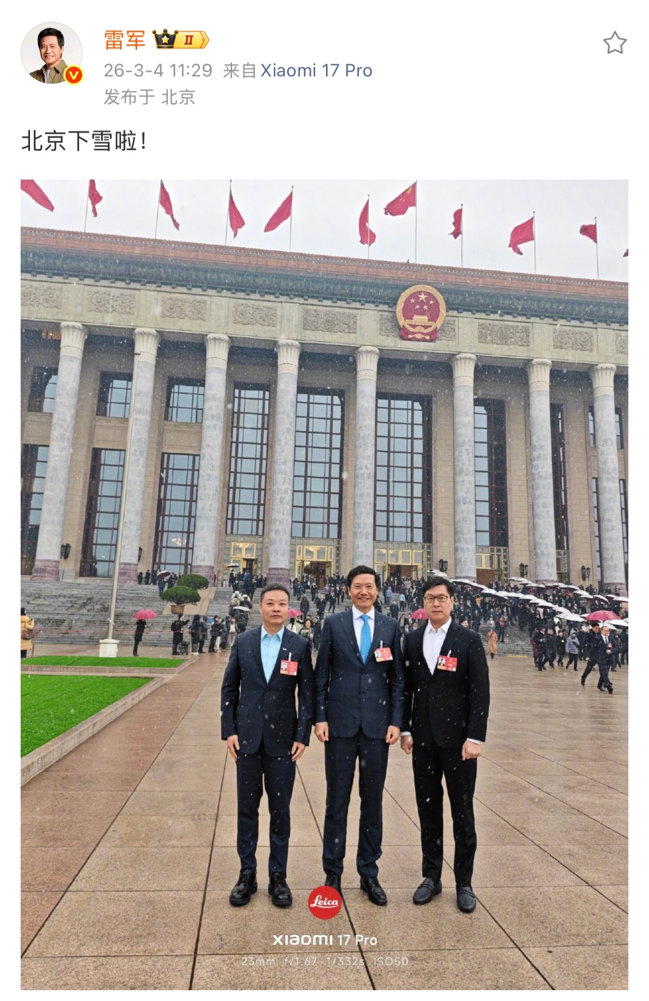 雷军和大师兄何小鹏还有姚劲波雪中合照
