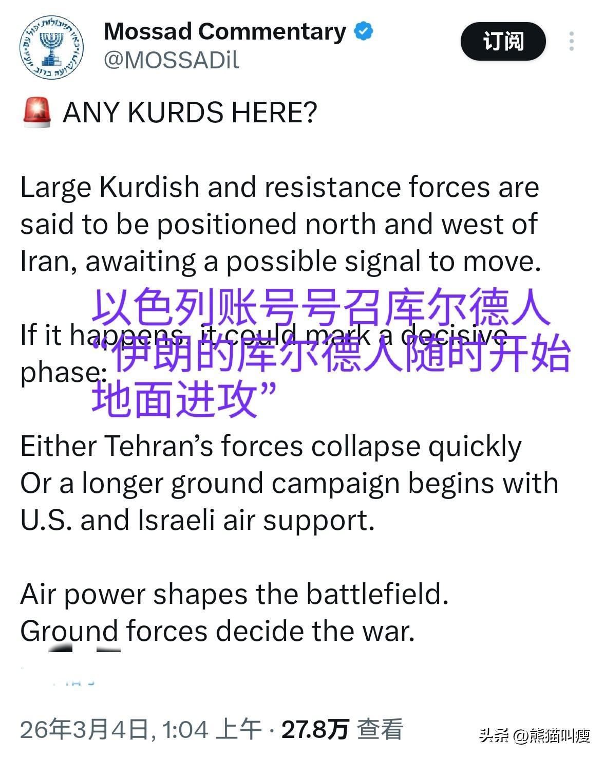 真是养兵千日(然而并没有)用兵一时啊,【为了生存下去】的库尔德才是最大的谎言。 目前美国和以色列一起供养的库尔德武装(不是土耳其那支)开始蠢蠢欲动,随时准备在伊朗搞事情(说好只是自保呢?)。 - 伊朗军方已经做出反应,与自己内部库尔德武装发生地面冲突:伊朗地面部队已进入伊朗库尔德斯坦省马里万地区,并通知居民撤离。 - 开战前有报道称,美国中情局正努力武装库尔德武装,使其能在几天内部署参与在伊朗西部举行的地面行动。 - 三支不同伊朗境内库尔德武装本是竞争关系,在2月底突然进行了合作并开始整合(全为了团结么不是) - 更巧合的是,过去几个月里,数千名伊朗和伊拉克库尔德人获得了大批武器。以色列宣传账号今天发帖:【库尔德人在吗?你们族人已经在伊朗西部和北部待命了哦🙄】