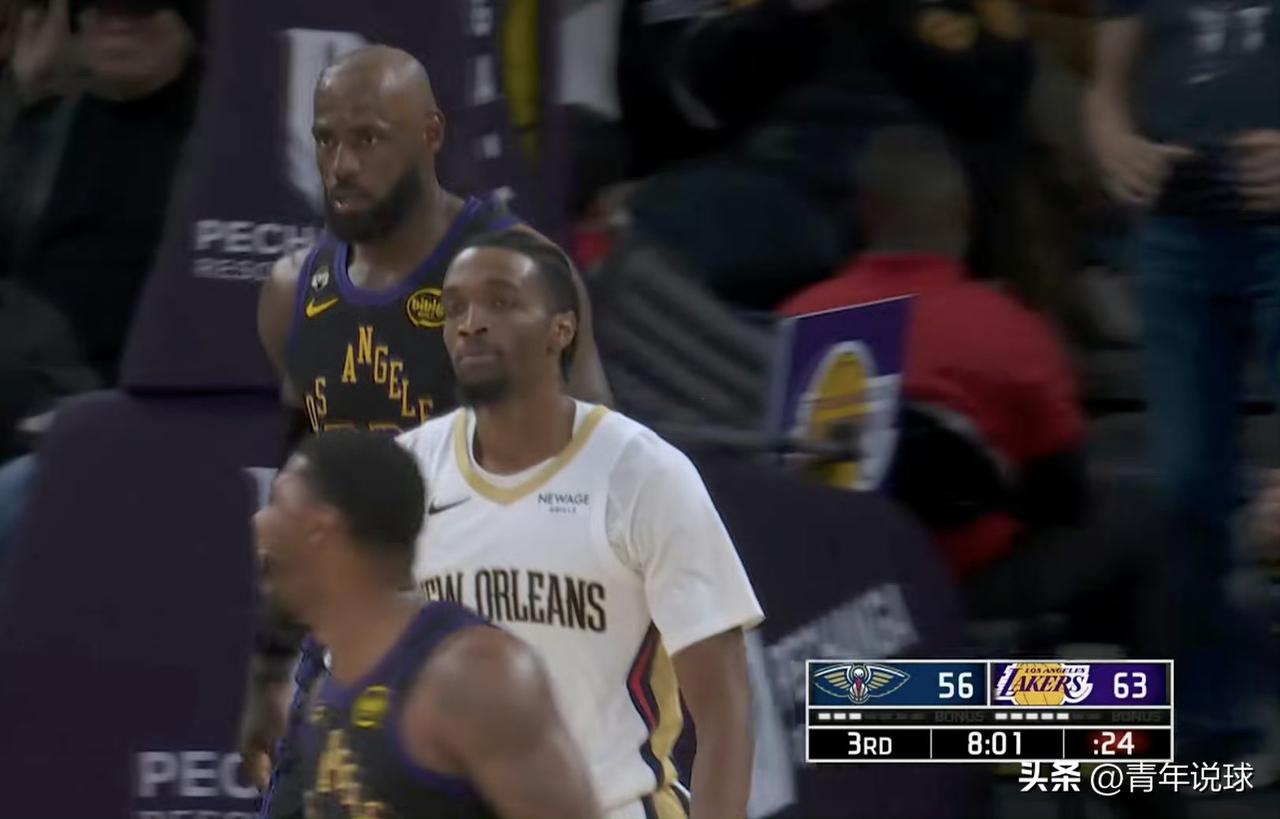 防守反击!詹姆斯滑翔劈扣打停鹈鹕! 第三节8分07秒,斯玛特精准判断萨迪克-贝的传球并成功完成抢断,快出界时极限传给了詹姆斯,两人发动快攻。詹姆斯再传斯玛特,后者持球推进吸引防守后回传詹姆斯,詹姆斯接球后滑翔劈扣得手,技惊四座,这个扣篮逼迫鹈鹕队喊出暂停。 斯玛特不愧是防守尖兵,这次抢断是他出色防守能力的体现,和詹姆斯的配合也非常完美,传球传得非常舒服,当然詹姆斯的扣篮终结更是亮眼,41岁还能这样扣篮终结,真不可思议!