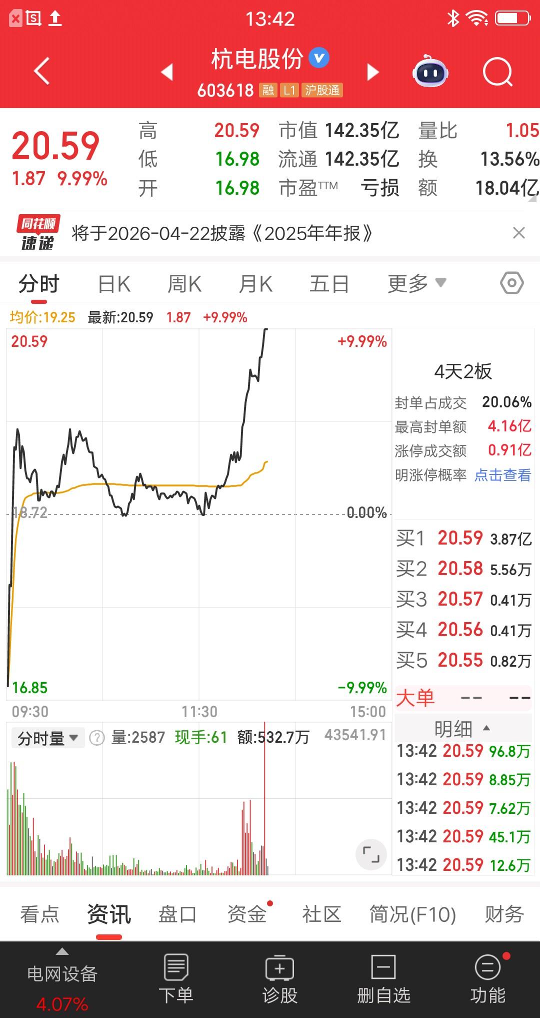 大A今天最牛的票提前锁定了,是电网设备板块的,午后上演地天板,太猛了。该票竞价大幅低开9.29%,可以说离跌停只差一点。开盘后急速拉升,由绿翻红。此后在0轴上方,反复震荡了小半天,午后开盘又是一波猛拉,涨停封板。 竞价就跑的资金,现在估计后悔死了,眼睁睁看着卖飞20个点。不过从交易纪律来说,严格执行没有问题。竞价买入的资金,走大运了,当天就吃大肉。有成本优势,即便明天跌停开,也有利润空间。 必须提醒的是,地天板看着刺激,但是发生的概率很低,切勿盲目尝试抄底。此文仅作为话题讨论,打发时间。 该票的炒作逻辑是,特高压+电力+超薄铜箔。