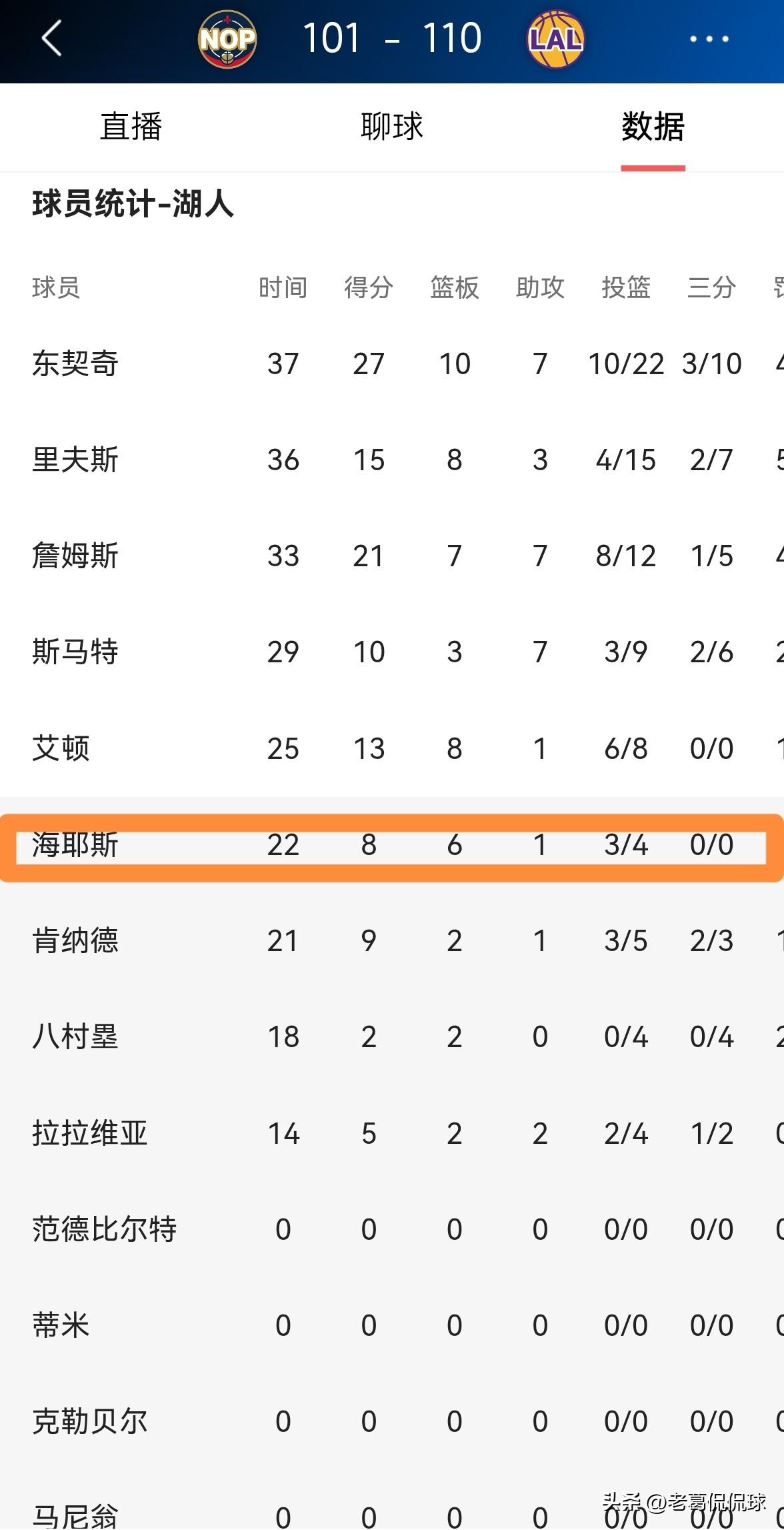 湖人中锋海斯的球队地位真是越来越高了!在今天湖人主场以110:101击败鹈鹕的比赛中,海斯的上场时间几乎和球队首发中锋艾顿的上场时间持平,这说明海斯在球队中的地位越来越高了。 全场比赛下来,海斯替补出战22分钟,投篮4中3,其中罚球2中2非常高效的得到8分,还有6篮板1助攻2盖帽,他的场上正负值为+16。 以目前的情况来看,如果艾顿继续低迷下去的话,那么海斯完全有可能取代艾顿的首发位置。