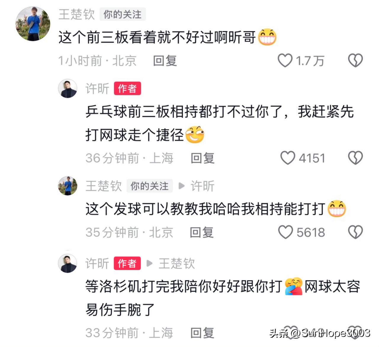 3.4日,王楚钦喊话许昕,许昕的一句话,超级暖心,有这个前辈,叫这声哥真的太值了! 王楚钦让许昕教他打网球,许昕暖心回复“洛杉矶打完我陪你,网球太容易伤手腕了” 许昕发了一个自己打网球的视频, 王楚钦来评论区留言:这个前三板不好过昕哥。 王楚钦一直喊许昕是昕哥, 昕哥回复:乒乓球前三板我打不过你了,赶紧转网球 王楚钦又说:可以教教我,我相持能打 接下来,许昕的一句话,真的是来自前辈的话,很温暖,很贴心,也很有大局观, 他的意思是:等到洛杉矶打完了,我再陪你打网球,因为网球伤手腕,你现在不能打。 王楚钦要先去打洛杉矶,国家利益永远在第一位。 许昕想的是,王楚钦要扛国家的旗,不能随随便便受伤,要保护好他, 同为运动员,他太了解王楚钦身上肩负的责任, 许昕也曾经身背冰袋,一天多赛,咬牙打比赛, 所以,他都懂。 其实,他完全可以说,等你有空我教你, 但是他没有,他直接说洛杉矶之后我陪你,网球太伤手腕, 言外之意,我不想让你打,你也要保护好自己的身体。 这就是前辈,无论在哪里,无论什么事情,会习惯性的把大局放在第一位。 王楚钦这声昕哥,这些年的尊重,太值了!
