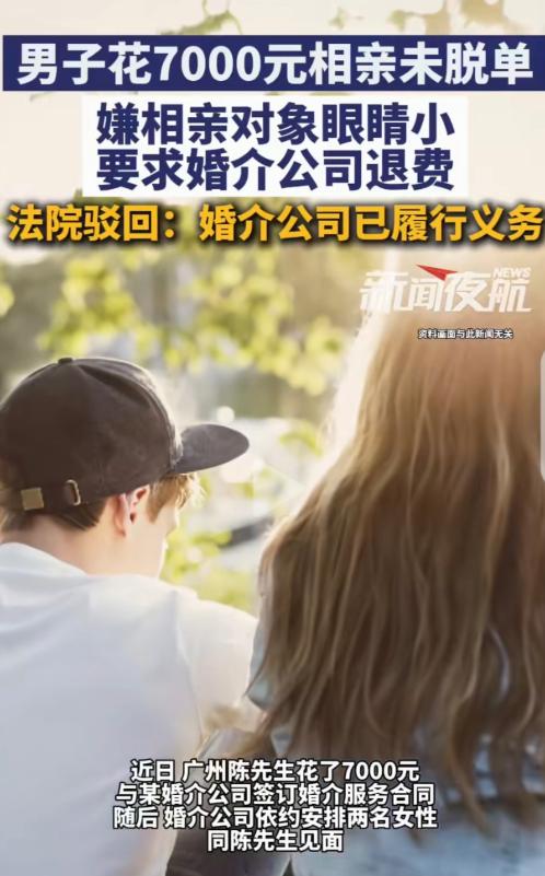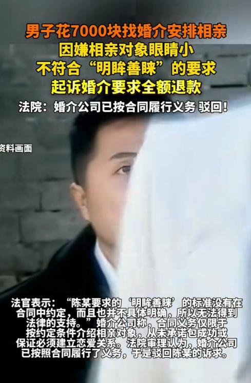广东广州,一男子花7000元, 去婚介所找对象,婚介所给他安排2个女子见面,男子却嫌弃女子眼睛太小,不符合他“明眸善睐”的标准,要求婚介所退钱,被拒后,他愤怒的把婚介所告上法庭,法院判决让他瞬间傻眼。 平日里,陈先生高强度的工作节奏,让他几乎没有闲暇时间拓展社交圈,更别说花费精力去认识异性、经营感情。 为了找到合适的伴侣,陈先生决定依靠婚介所。 他在网上反复比对了多家婚介所,逐一排查了用户评价和机构资质,最终选中了一家婚介所。 这家婚介所装修精致、环境整洁,门口悬挂的各类荣誉牌匾,也让陈先生多了几分信任。 初次到店咨询时,接待他的红娘热情周到,耐心细致地询问了他的年龄、身高、收入、家庭背景等基本情况,随后便重点询问了他的择偶需求。 他对伴侣的物质条件、外貌长相没有过高要求,但必须是“明眸善睐”的类型。 随后,红娘向陈先生介绍了不同价位的服务套餐,价位越高,后续的撮合服务也越细致。 陈先生深知,找对象是人生大事,不愿敷衍了事,最终选择了一款7000元的。 仅仅过了几天,红娘便打来电话,语气欣喜地告知陈先生,已经为他物色好了两位女生,让他第二天下午前往婚介所的见面室,参加线下见面。 接到电话的陈先生欣喜若狂,激动得久久无法平复,当晚更是翻来覆去难以入眠,脑海里反复浮现着即将见面的姑娘的模样,满心都是期待。 第二天,他便按照约定抵达婚介所。 不久后,第一位女生如约而至。女生气质文静,说话温温柔柔,长相清秀、身材匀称,整体条件十分不错,若是换做其他男生,或许早已心生好感。 但陈先生的目光落在女生的眼睛上时,心中的期待瞬间消散,甚至泛起一丝失望——他觉得,这位女生的眼睛偏小,与他心中“明眸善睐”的标准差得甚远。 整场见面,女生主动搭话,他也只是寥寥数语。 随后,他便以“还有要事”为由,匆匆结束了这场见面,丝毫没有给对方进一步了解的机会。 送走第一位女生后,陈先生立刻找到红娘,脸色阴沉,语气急促地提出质问:“你是不是忘了我跟你强调的要求?我想要明眸善睐的,你这分明就是在糊弄我!” 陈先生根本听不进任何解释,态度坚决地表示,不符合要求就是不符合要求。 红娘无奈,只能联系第二位女生,一段时间后,第二位女生抵达现场。 这位女生一进门便主动打招呼,十分热情。 但陈先生依旧觉得这不是他心中的“明眸善睐”。 陈先生和那位女生交谈结束后,陈先生便迫不及待的拉着红娘激烈理论,语气比之前更加激动。 他指着红娘,怒气冲冲地说道:“我花7000块钱,不是来见不符合要求的人的!你们这是明显的违约,必须全额退还我的7000块钱,否则我绝不善罢甘休!” 见陈先生态度强硬,红娘也不再耐心解释,语气也强硬起来,与陈先生据理力争。 每个人的审美不同,陈先生觉得眼睛小,或许其他人觉得恰到好处,婚介所无法满足每个人的主观审美。 两人争执不休,声音越来越大,整个婚介所都能听到,周围的工作人员纷纷上前劝架,却始终无法平息陈先生的怒火。 回到家后,陈先生依旧怒火难平,他觉得自己花了钱,不仅没有找到合心意的伴侣,还受了一肚子气,婚介所的行为无疑是欺骗消费者。 为了维护自己的权益,他立刻收集好相关证据,向法院提起诉讼,她的请求十分明确:要求婚介所全额退还7000元服务费。 最终,法院认为,陈先生提出的“明眸善睐”的要求,属于主观审美标准,没有明确、具体的判断依据,且未在合同中明确约定,所以,不能作为认定婚介所违约的依据。 (信息来源:新闻夜航)