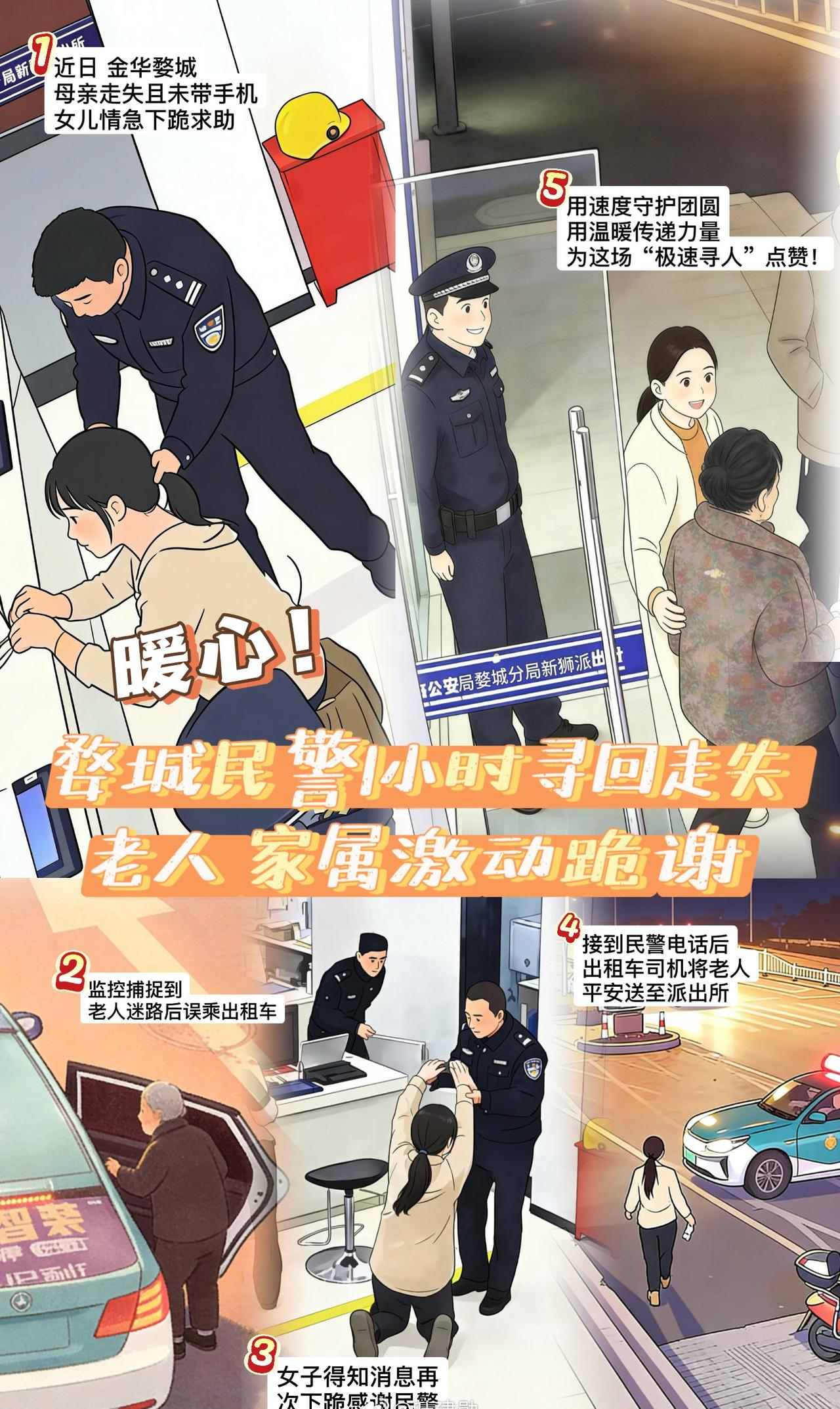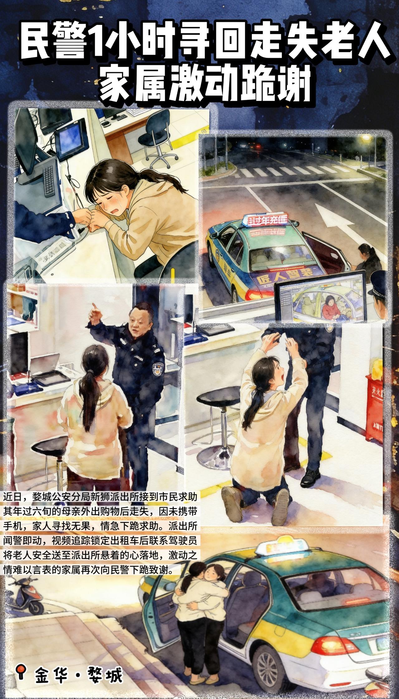 【浙江警民接力1小时找回走失母亲】近日,浙江金华,婺城公安分局新狮派出所接到市民求助,其年过六旬的母亲外出购物后走失,因未携带手机,家人寻找无果,情急之下向民警求助。派出所闻警即动,视频追踪锁定出租车后联系驾驶员将老人安全送至派出所。悬着的心落地,激动之情难以言表的家属再次向民警致谢。金华超话@金华公安 八婺同心人民警察暖心图鉴
