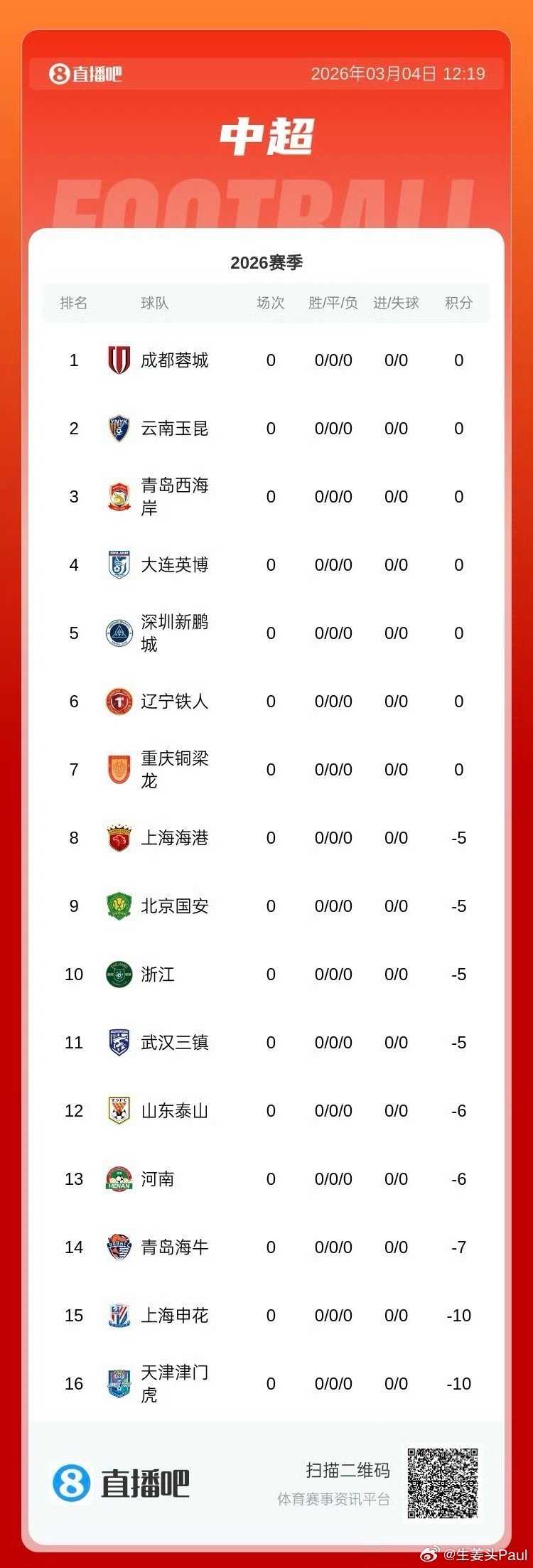 2026中超联赛即将热血重启!这将注定是特别的一个赛季,中超多达9支球队以负分开局,争冠和保级的局势被彻底搅乱、悬念拉满!谁能破局夺冠,让我们拭目以待!